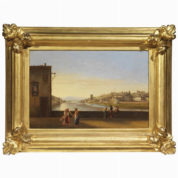Scuola toscana, sec. XIX VEDUTA DI FIRENZE olio su tela, cm 35x53 datato 1844 in basso a destra retro: sul telaio iscritto fatto dall'/ Ill.mo Sig. Scipione Capponi/ Veduta di Firenze