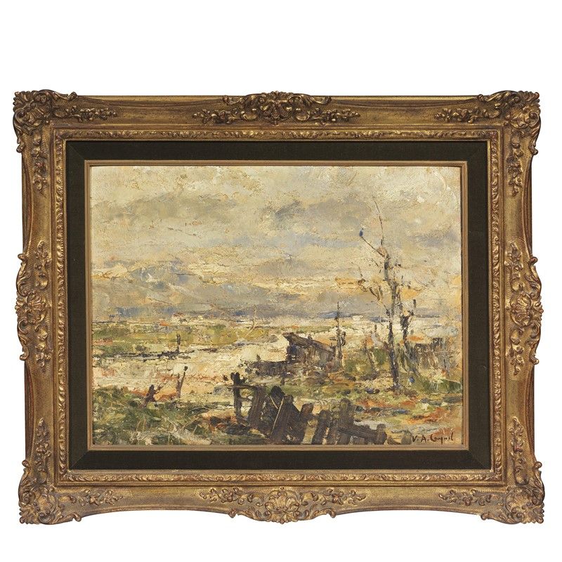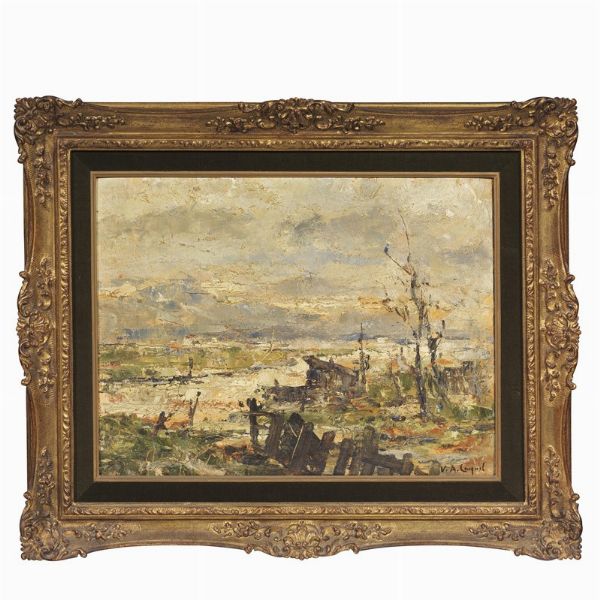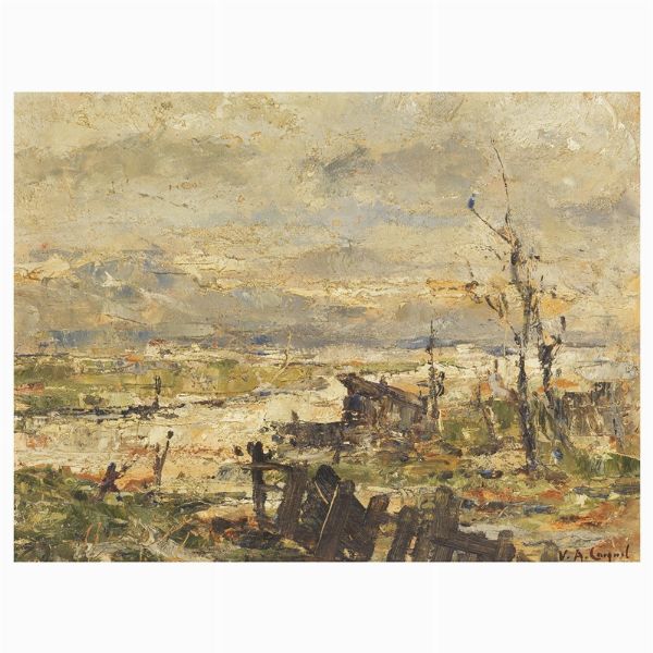 Vittore Antonio Cargnel (Venezia 1872 - Milano 1931) IL PIAVE DAL MONTELLO olio su cartone, cm 30x40 firmato in basso a destra retro: titolato e datato Autunno 1925, dichiarazione di autenticità firmata da Lucio Cargnel
