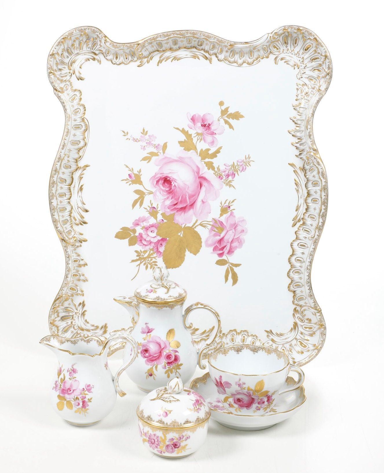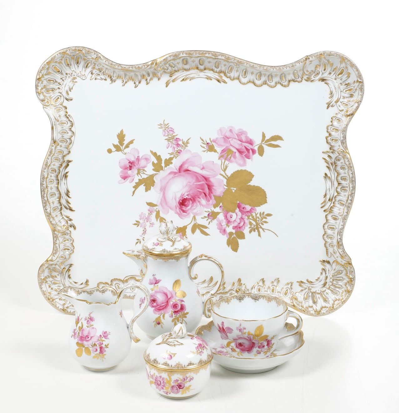 Vassoio, caffettiera, lattiera, zuccheriera e tazza con piattino.