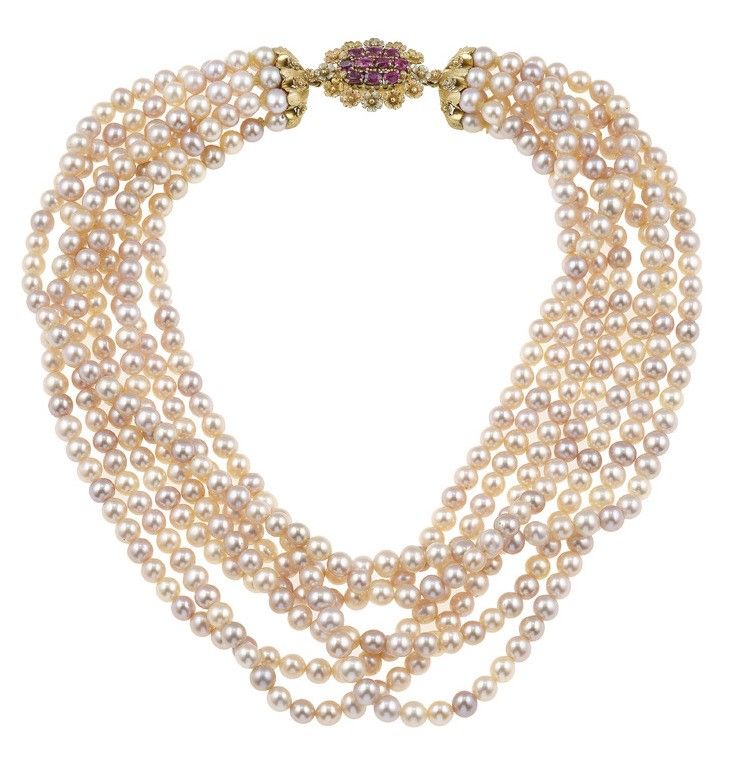 Girocollo a più fili con perle rosa coltivate e piccoli rubini