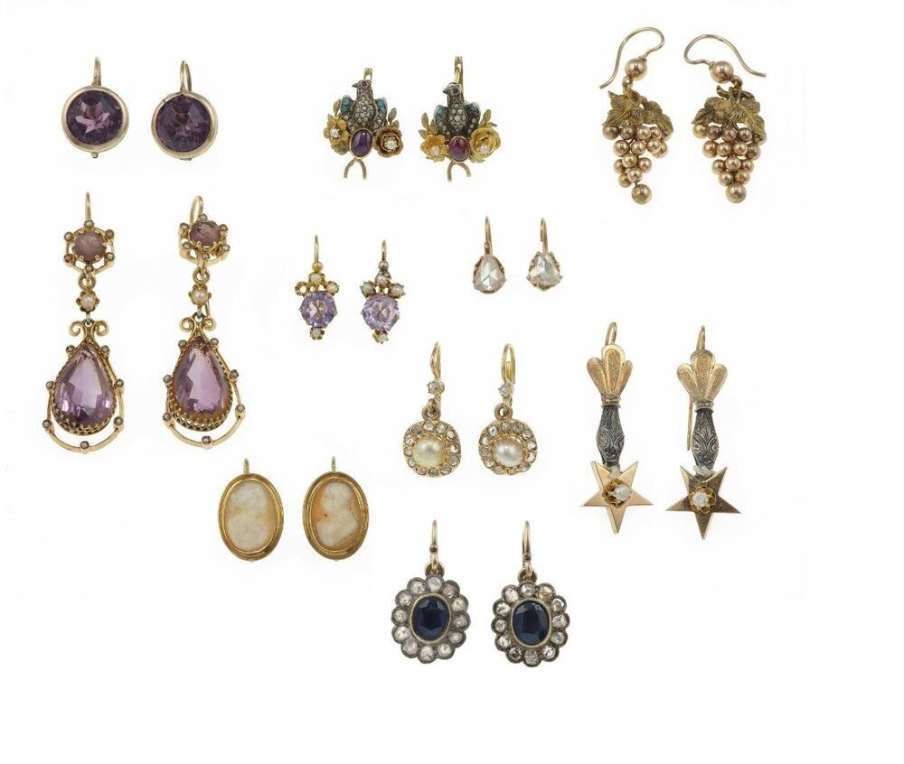 Lotto composto da dieci paia di orecchini, piccoli diamanti, gemme sintetiche, quarzi, [..]
