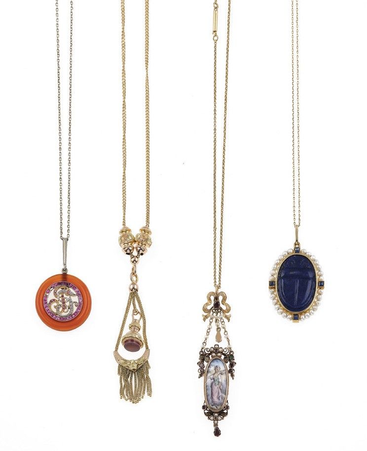 Lotto composto da quattro pendenti con miniatura, perle e piccoli diamanti