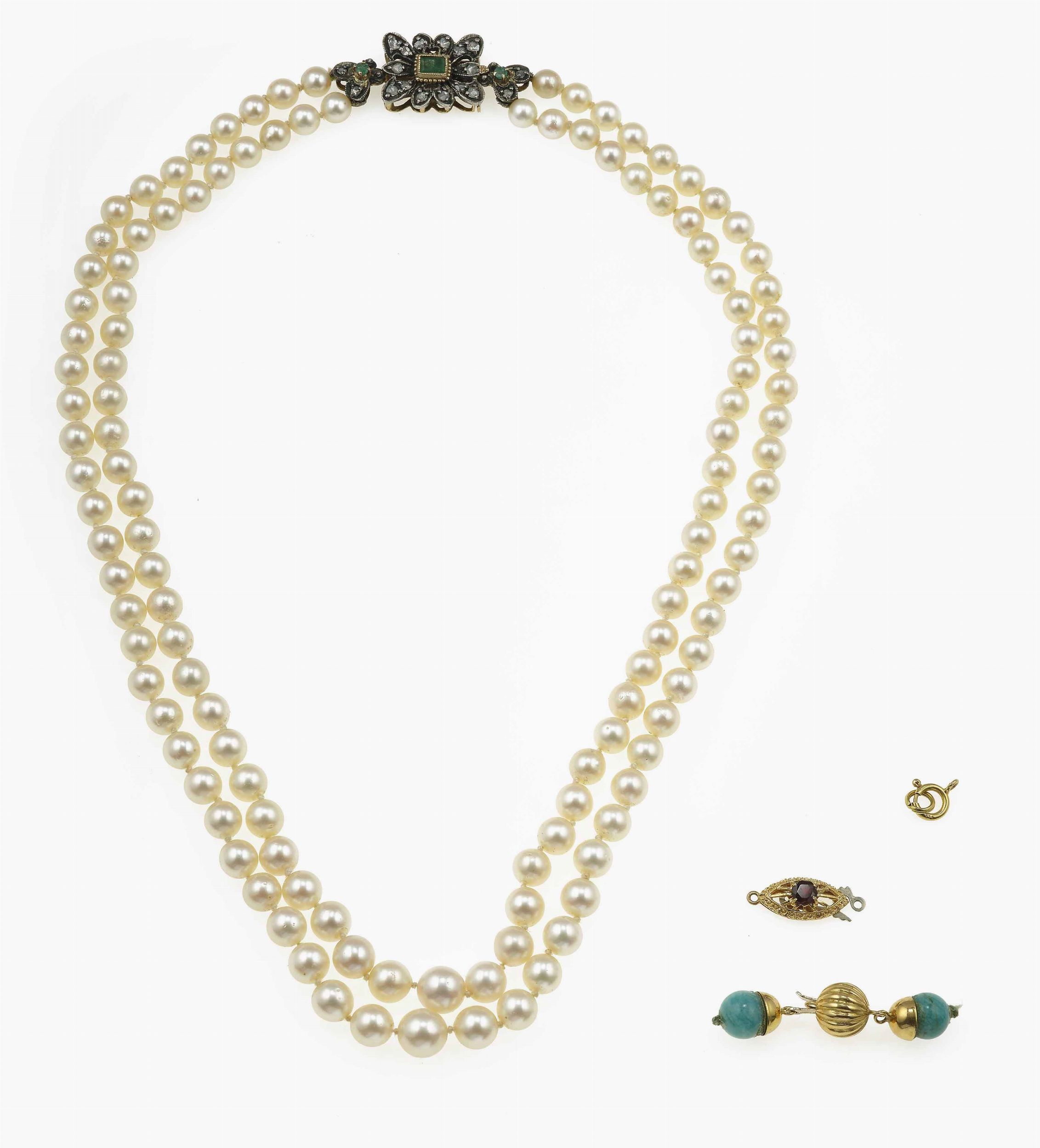 Lotto composto da tre fermezze ed una collana a due fili di perle coltivate