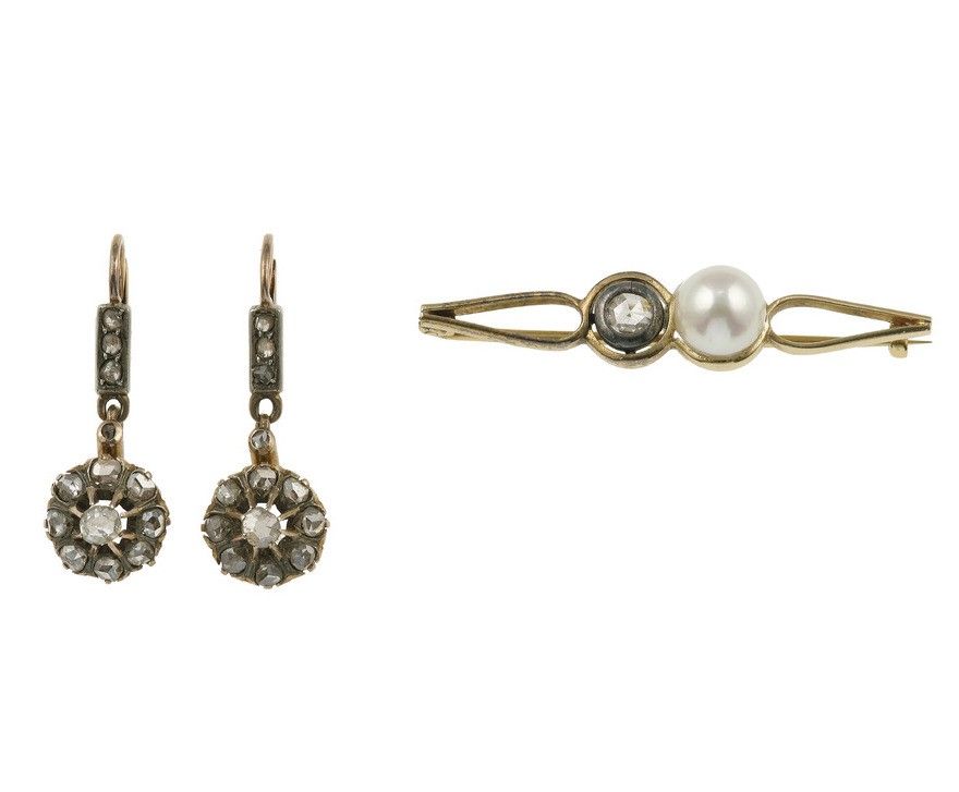 Lotto composto da un paio di orecchini ed un spilla con perle coltivate e rosette [..]