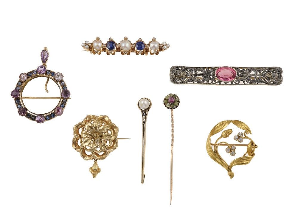 Lotto costituito da cinque spille, una spilla pendente e uno spillone, con perle, [..]