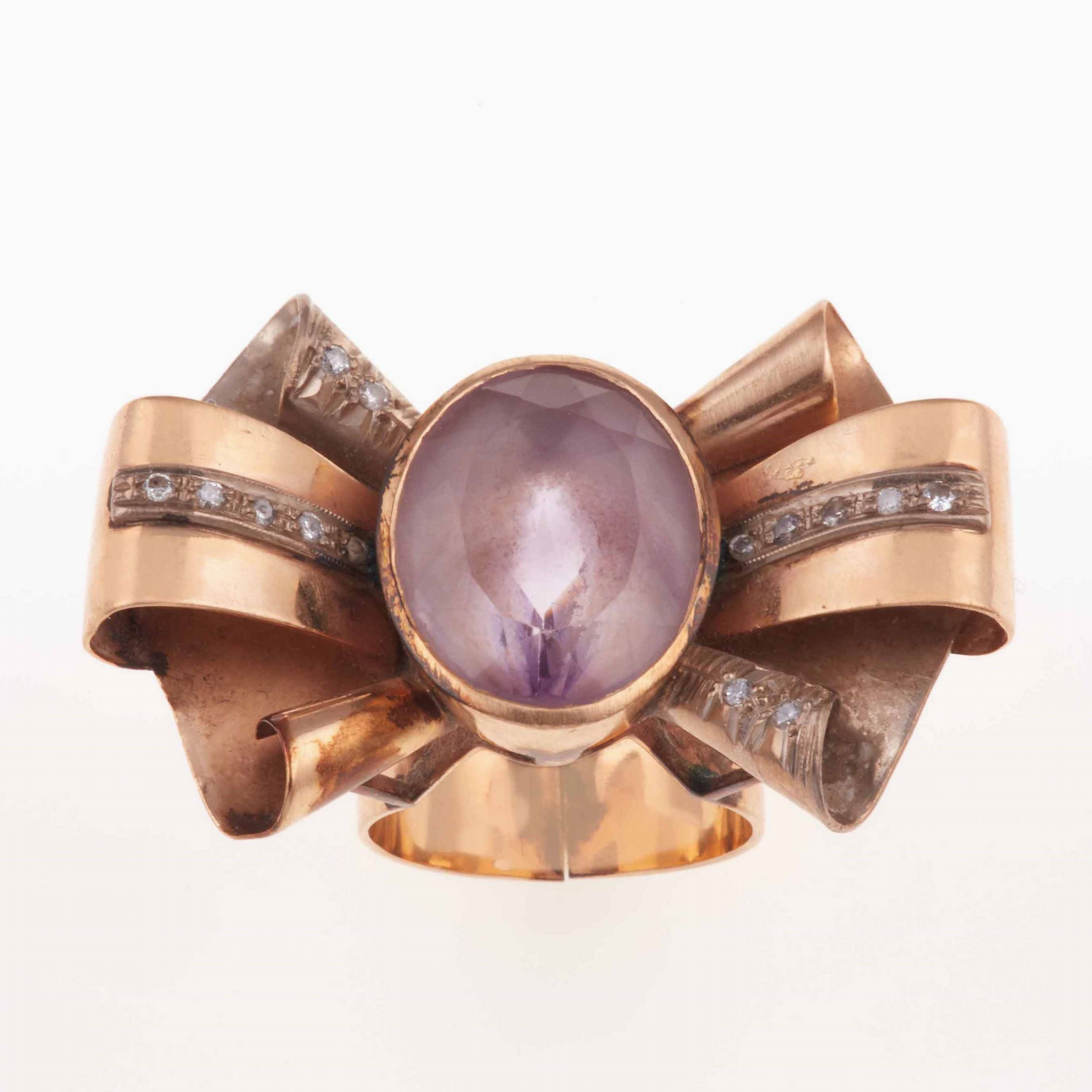 Lotto costituito da due spille e un anello con piccoli diamanti