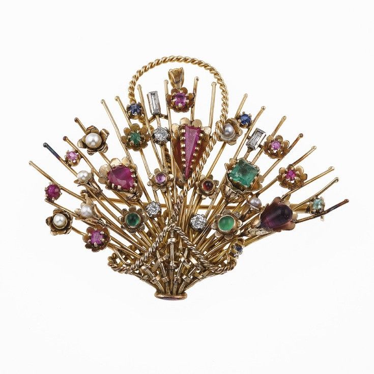 Spilla “cestino” con gemme sintetiche, diamanti, perle, smeraldi, rubini e z [..]