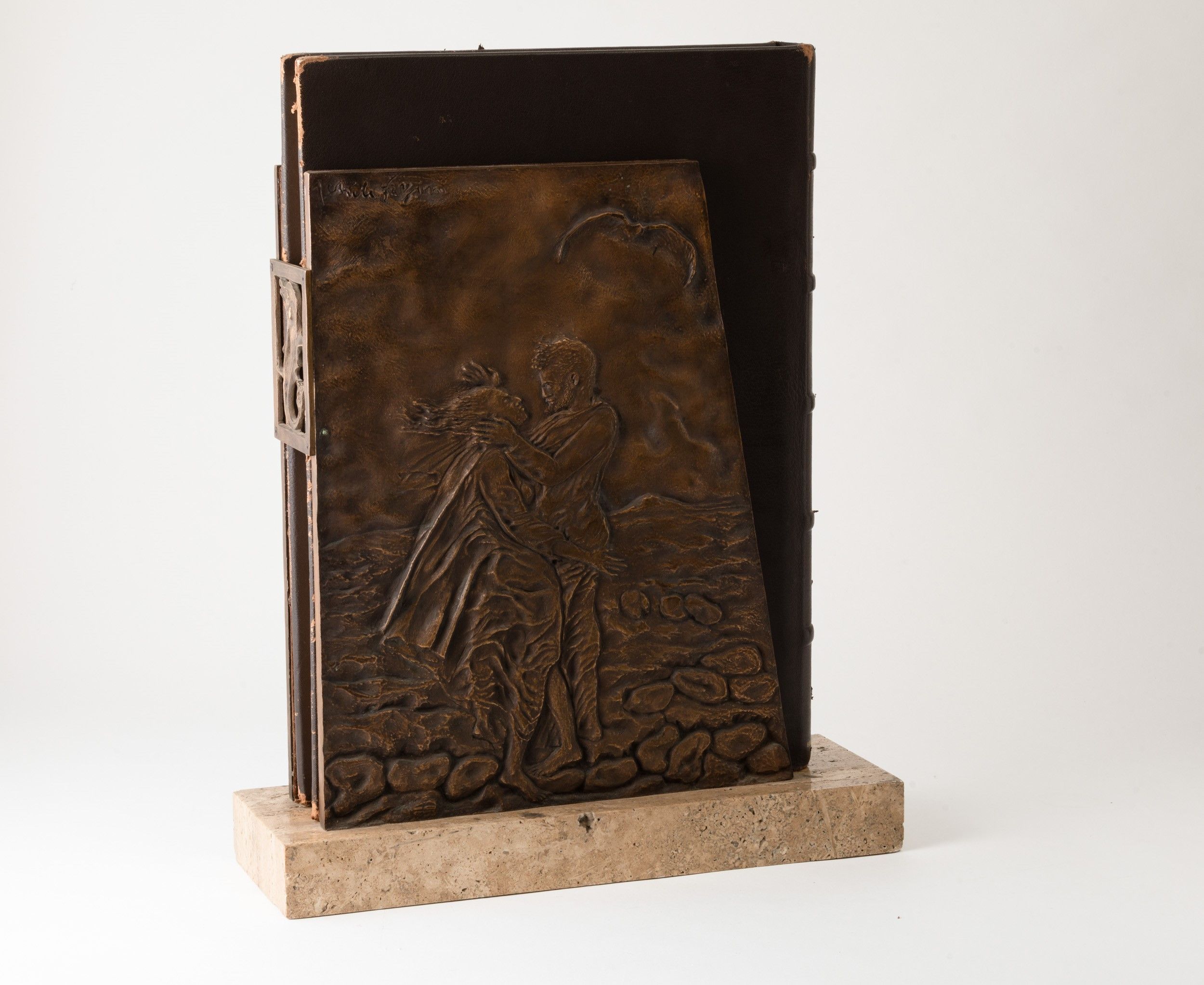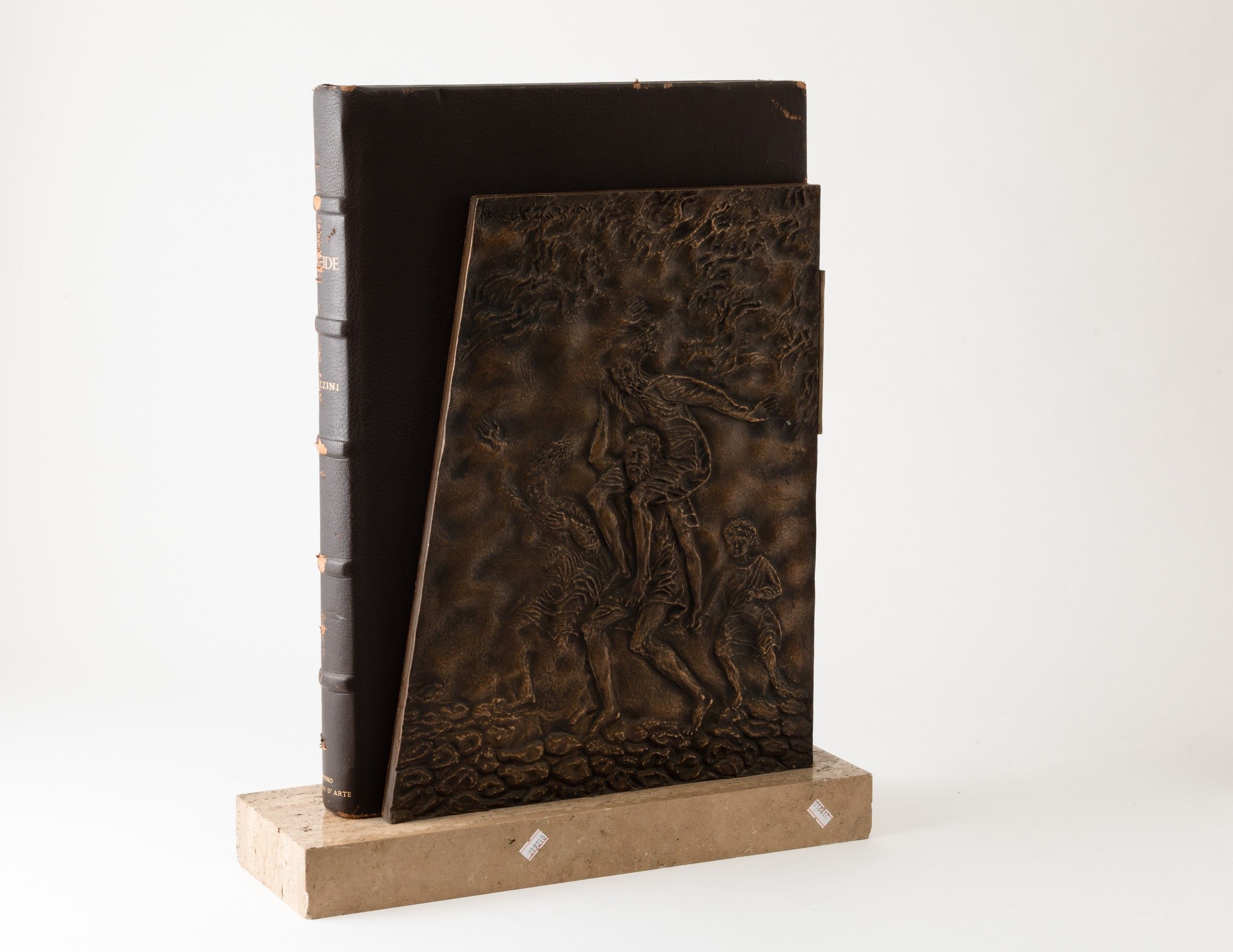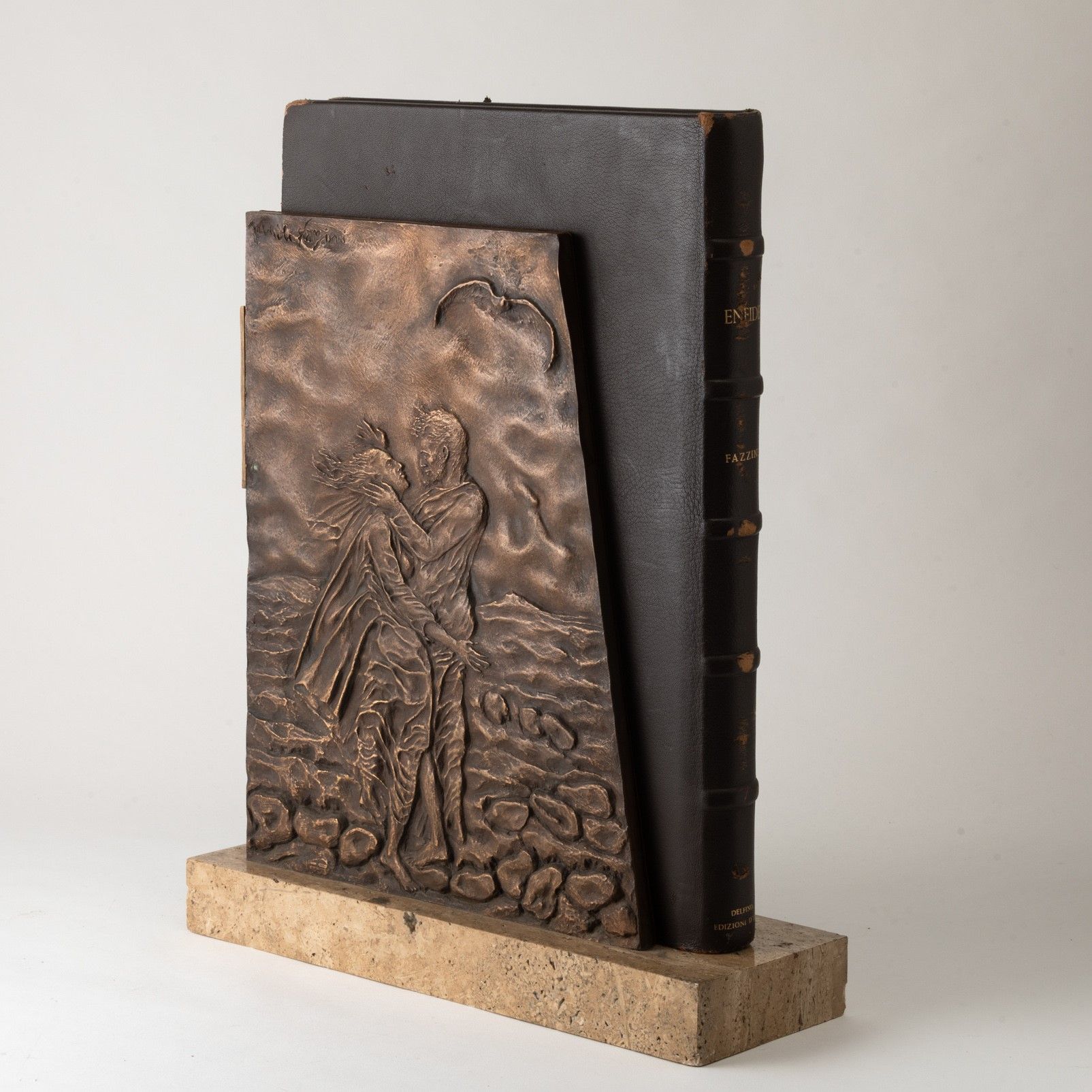 volume accompagnato da un bassorilievo in bronzo fuso poggiante su piedistallo di travertino romano, Largh. 34 - Alt. 44 cm