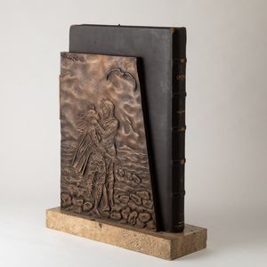 volume accompagnato da un bassorilievo in bronzo fuso poggiante su piedistallo di travertino romano, Largh. 34 [..]