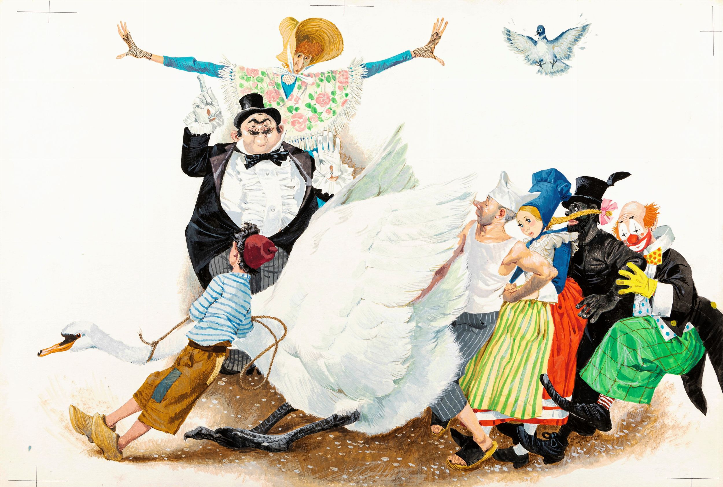 1967 Illustrazione originale realizzata da Maraja per la fiaba Cigno, appiccica! edita nel 1967.