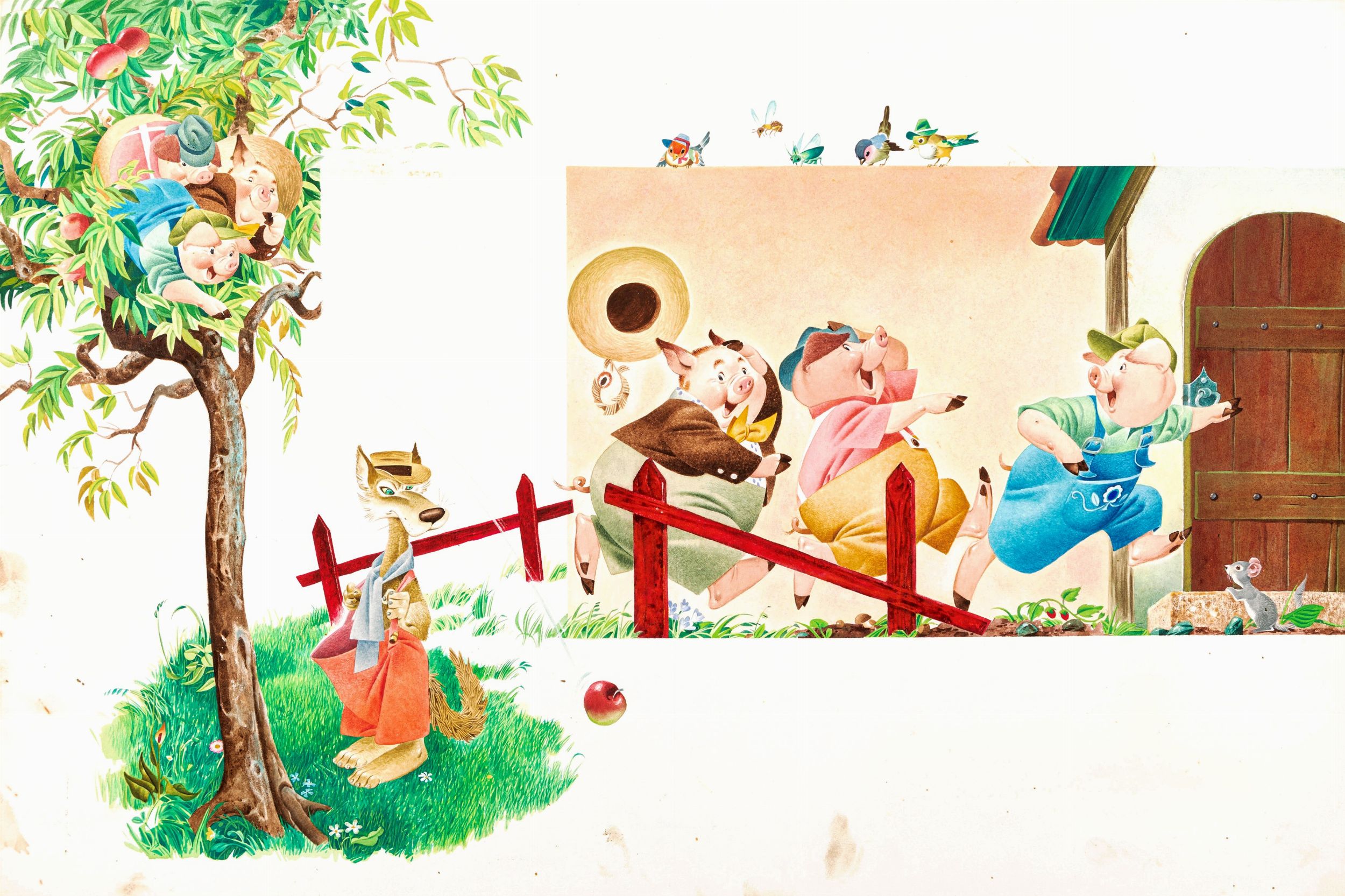 1968 Illustrazione originale realizzata da Lupatelli per la fiaba I tre porcellini edita nel 1968. Piccola frattura al margine sinistro.
