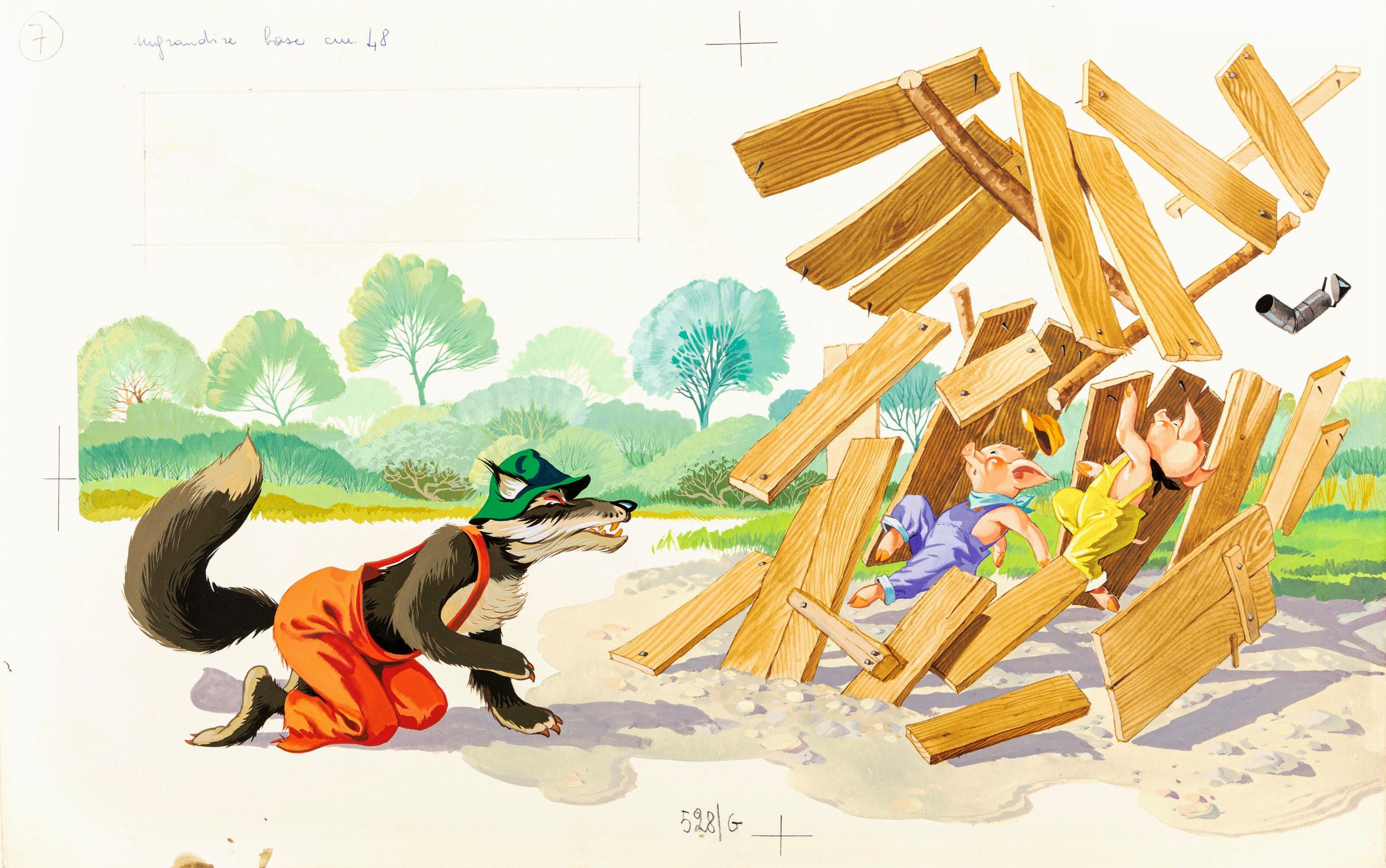 1962 Illustrazione originale realizzata da Berselli per la fiaba I tre porcellini edita nel 1962.