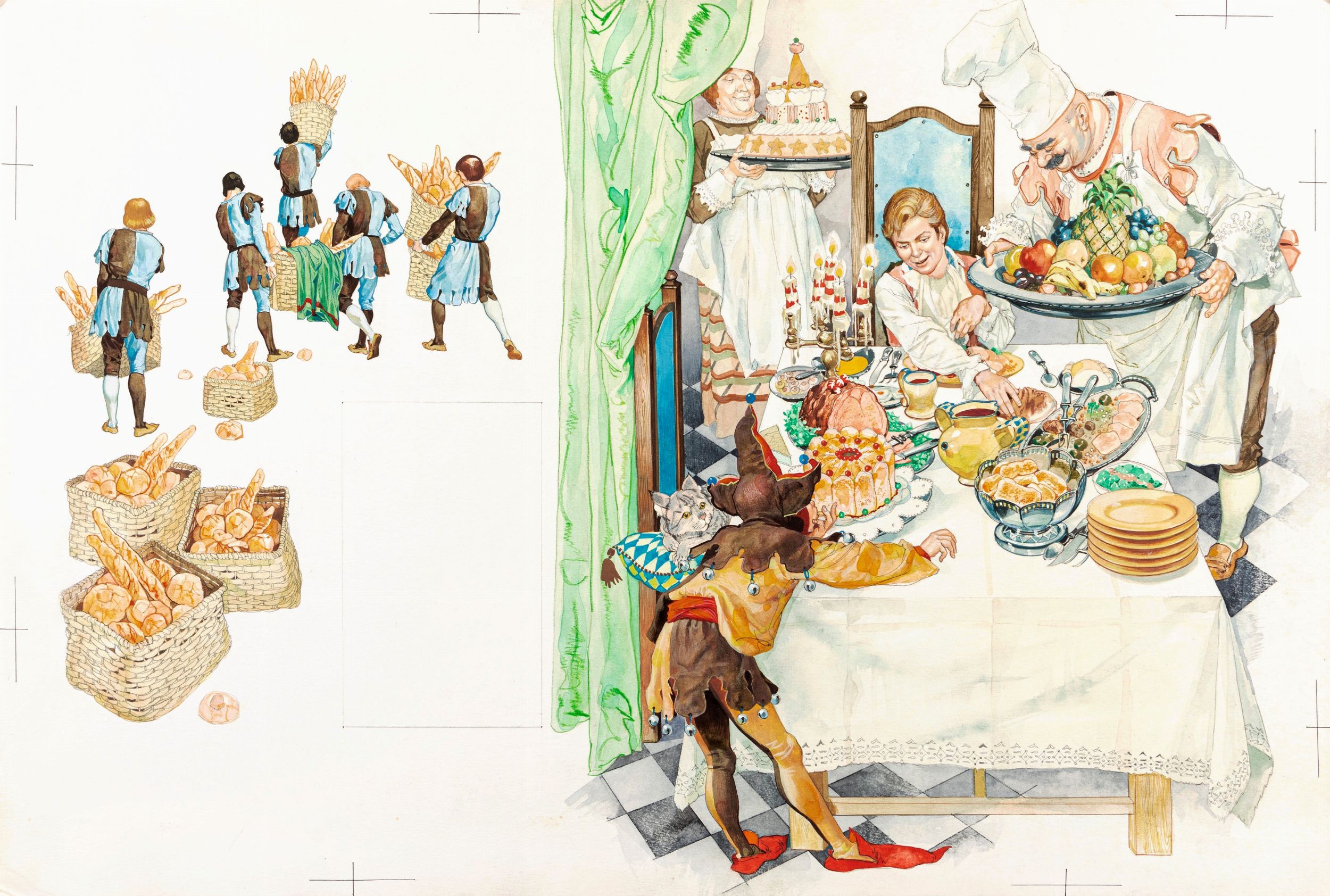 1966 Illustrazione originale realizzata da Sergio per la fiaba Il capraio e la figlia del re edita nel 1966. Lieve piega all'angolo inferiore sinistro.