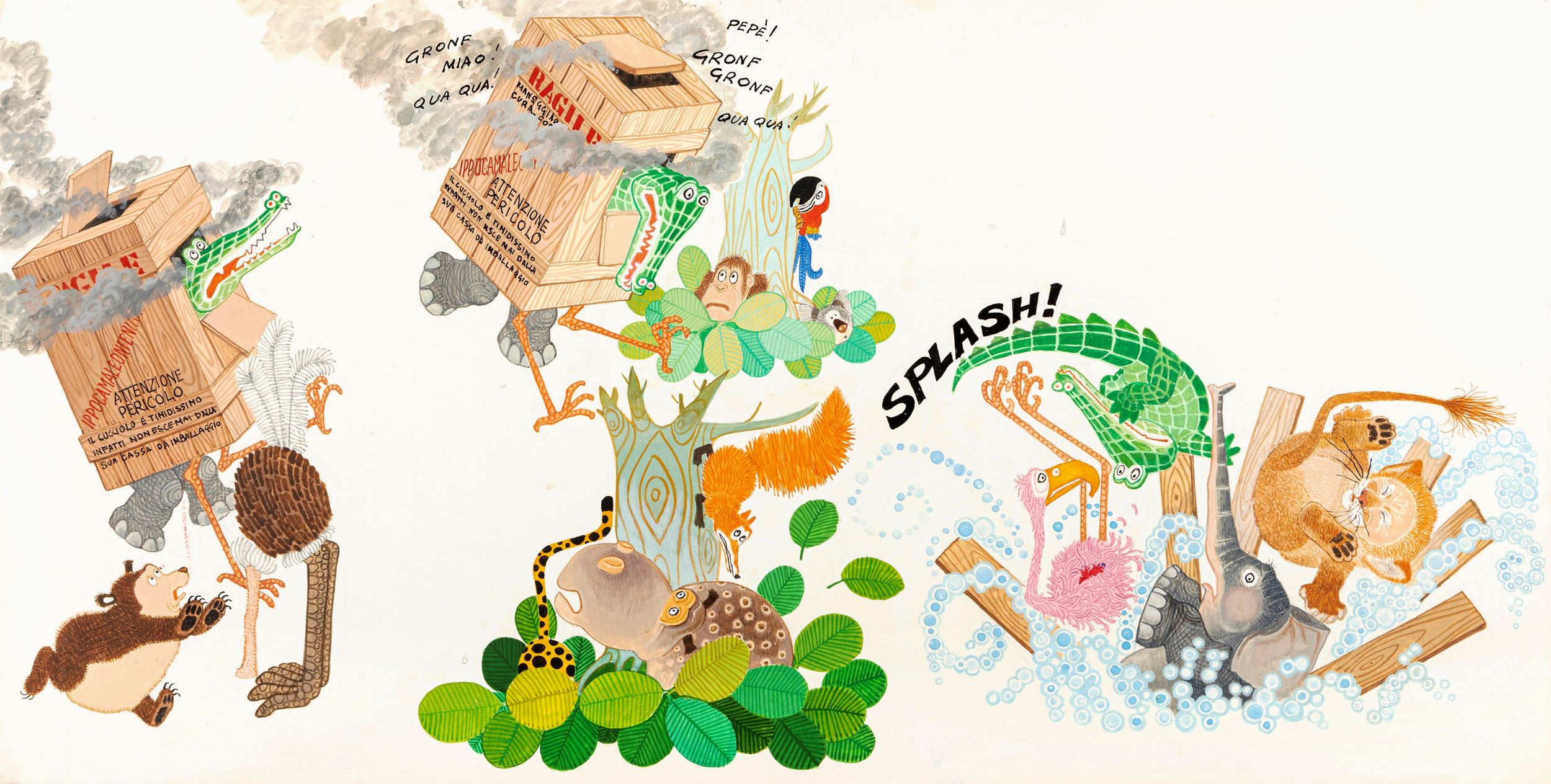 1970 Illustrazione originale realizzata da Benvenuti per la favola Ippocamaleonfenicottero, uno per tutti tutti per uno edita nel 1970.