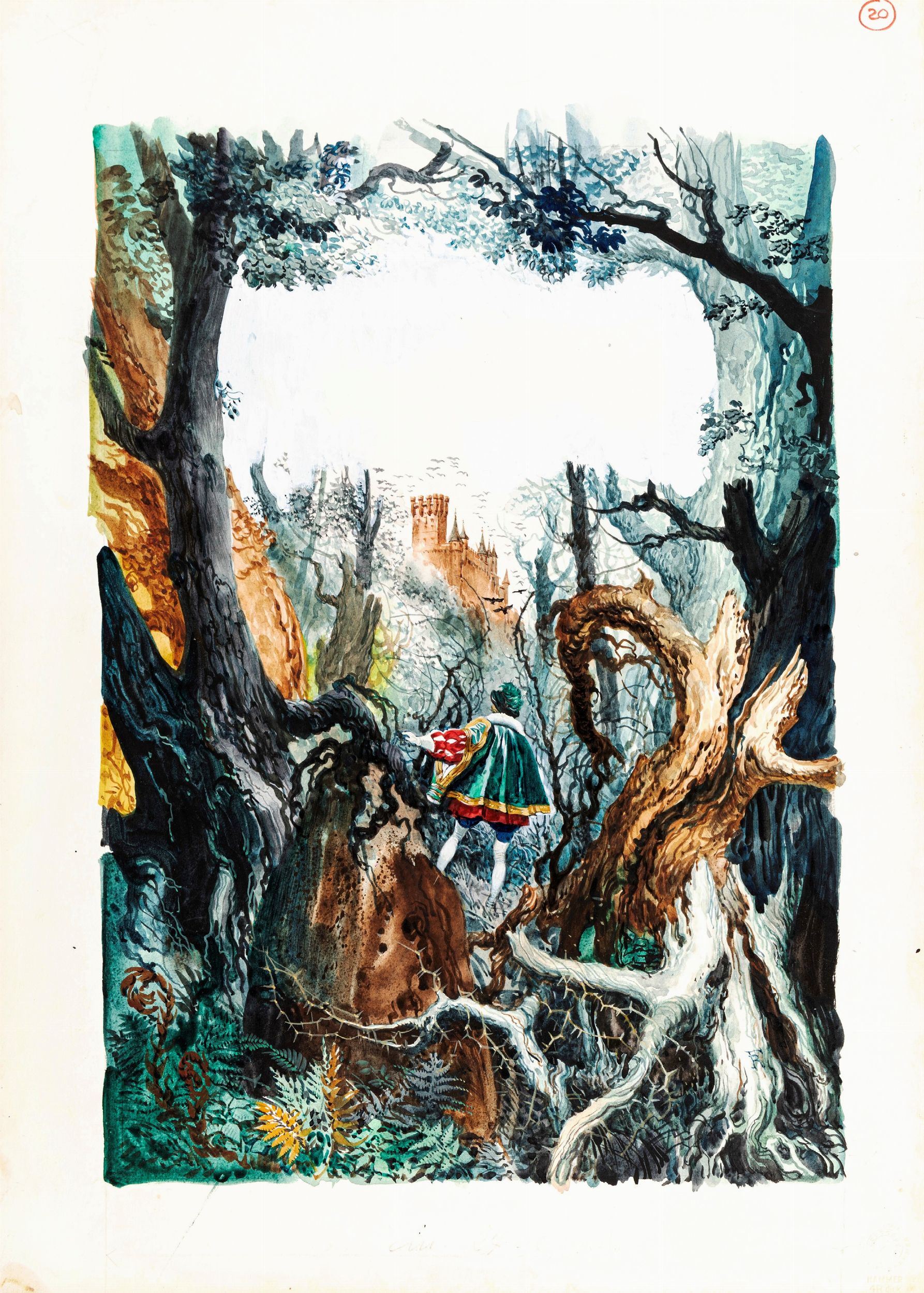 1966 Illustrazione originale realizzata da Ferri per la fiaba La bella addormentata nel bosco edita nel 1966. Firmata.