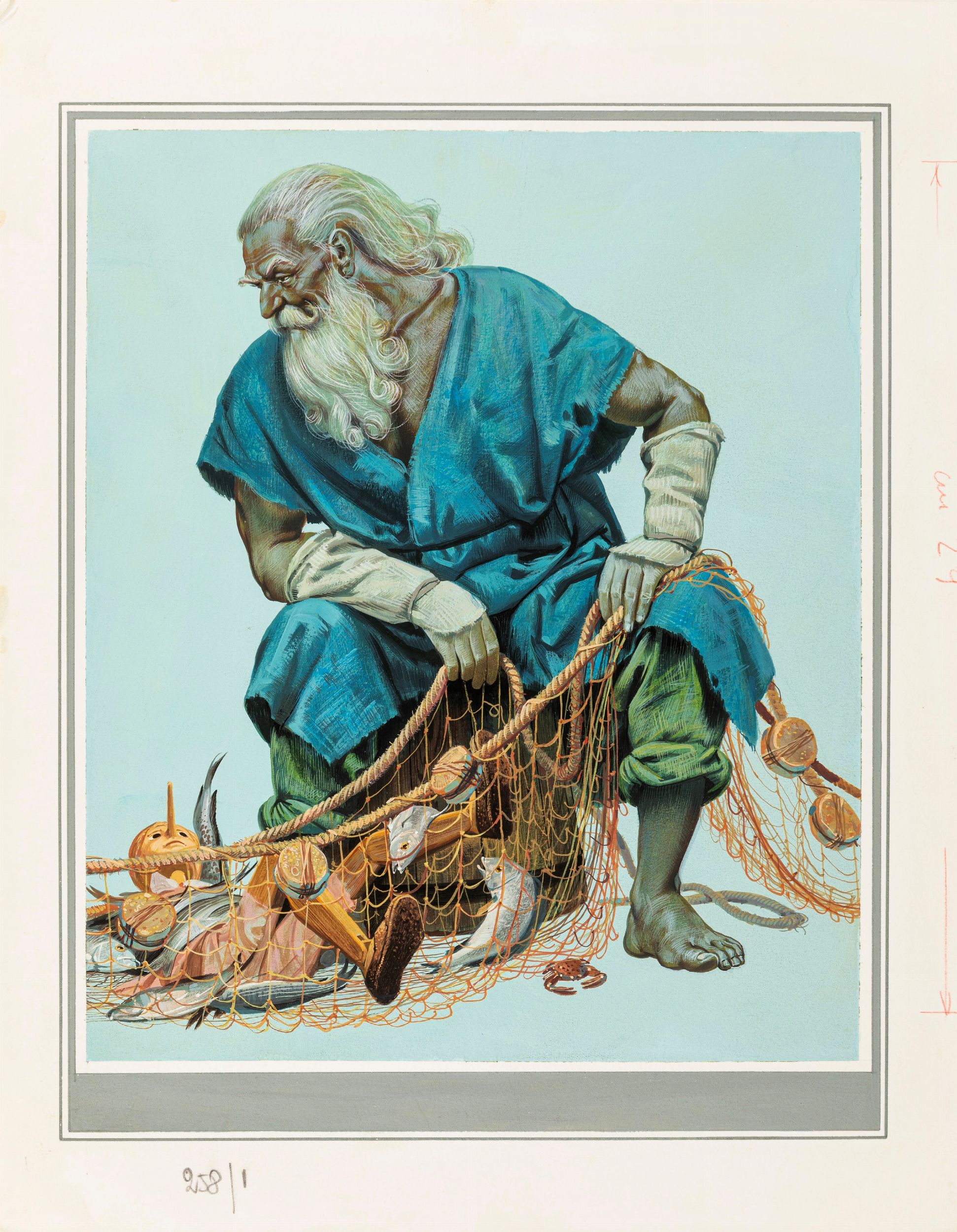 tempera su cartone, 25 x 32 cm anni '60 Illustrazione originale realizzata da Sergio per la sua celebre interpretazione de Le avventure di Pinocchio di Carlo Collodi, edita tra il 1961 e il 1965. Lieve piega all'angolo superiore e inferiore sinistro.