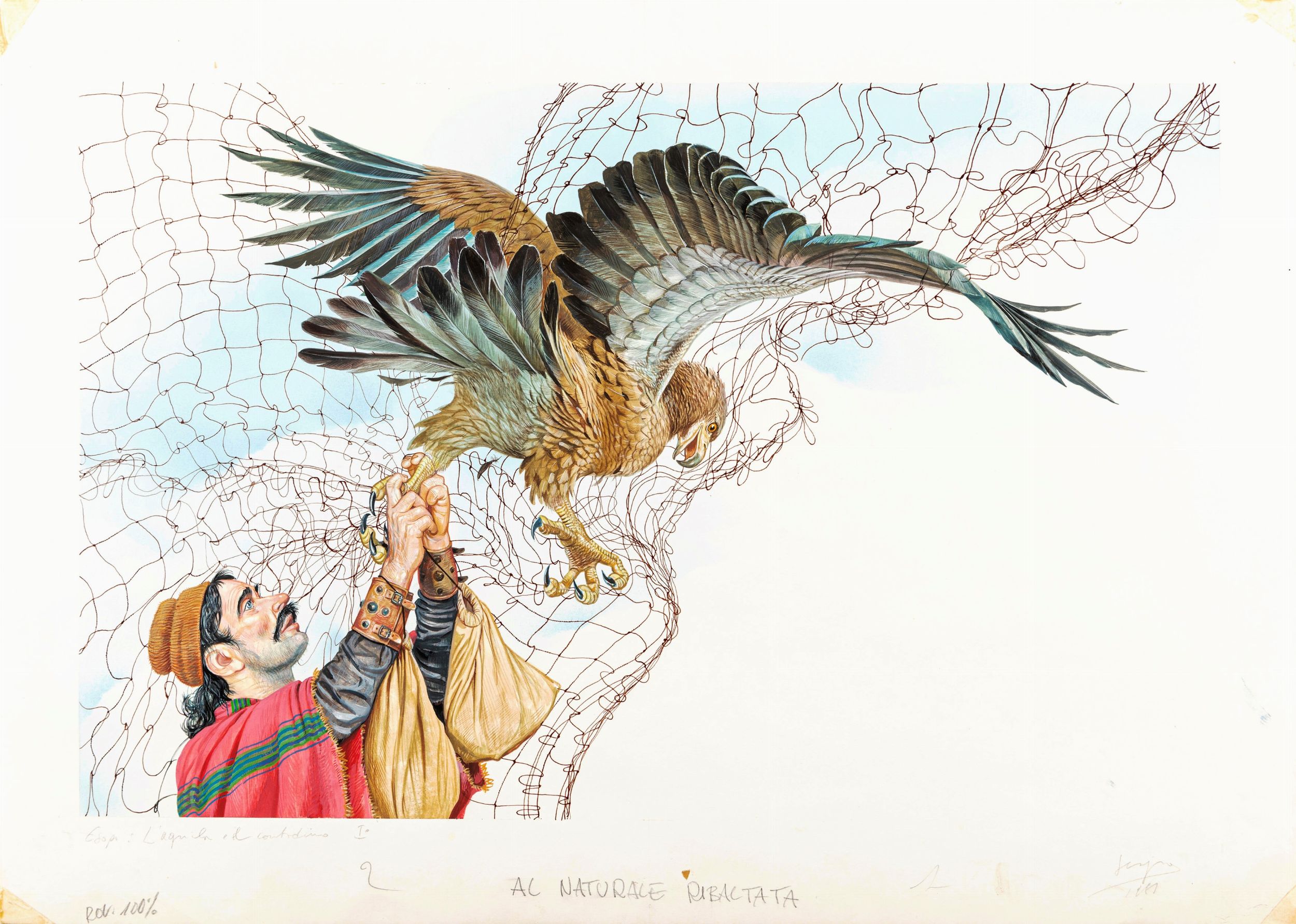 Sergio (Romano Rizzato) : Le favole di Esopo - Il contadino e l'aquila  - Asta Fairy Tales / Illustrazioni Originali - Associazione Nazionale - Case d'Asta italiane