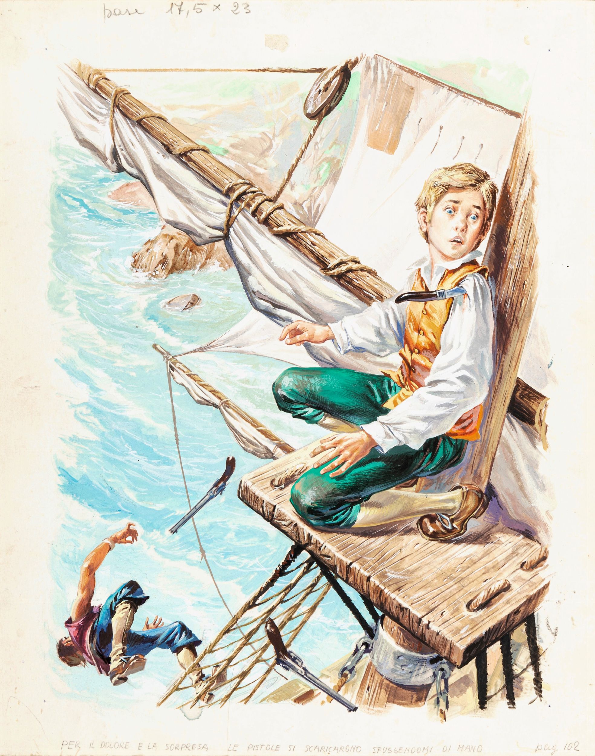 1955 Illustrazione originale realizzata da Maraja per una riduzione illustrata del romanzo L'isola del tesoro di R. L. Stevenson edita nel 1955. Fori di affissione agli angoli.