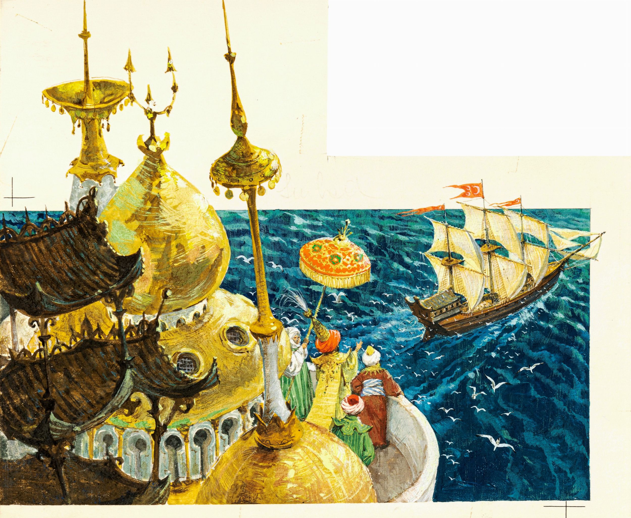 1964 Illustrazione originale realizzata da Maraja per la fiaba Sinbad il marinaio edita nel 1964.
