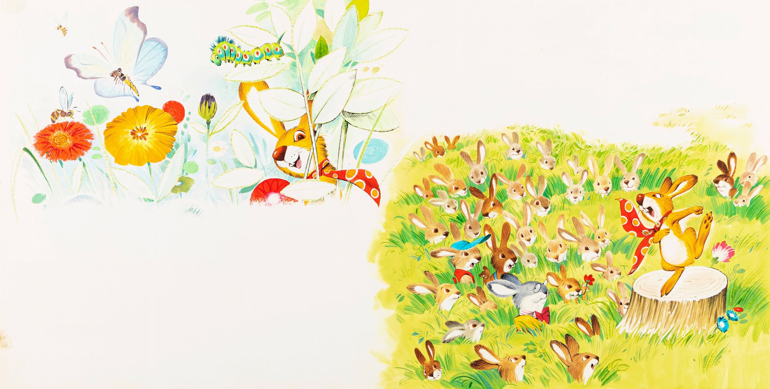 1970 Illustrazione originale realizzata da Lupatelli per la favola Starter leprotto autista edita nel 1970.
