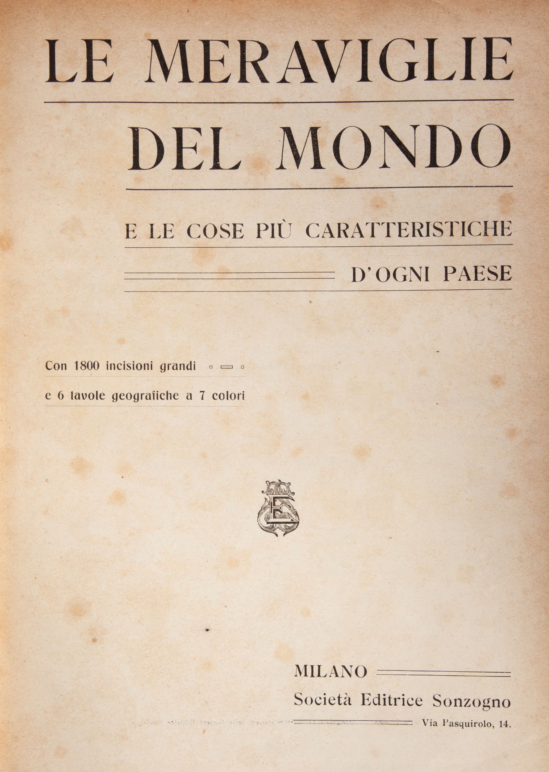 cm 31x23 Treves, Milano 1875 Unito: Le meraviglie del mondo. E le cose più caratteristiche d'ogni Paese, Sonzogno Milano 1908 (cm. 30x23). Legature in tela coeva con titoli al dorso.