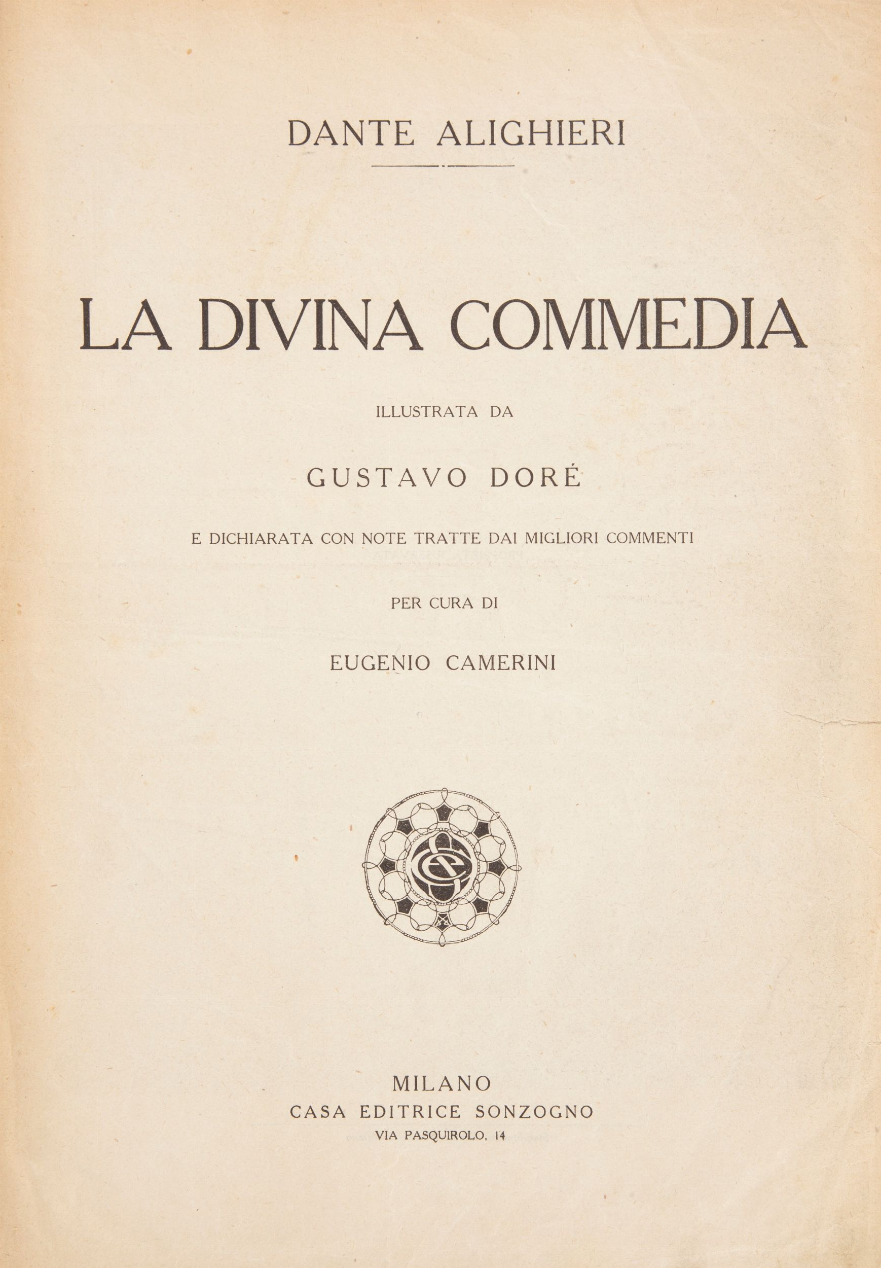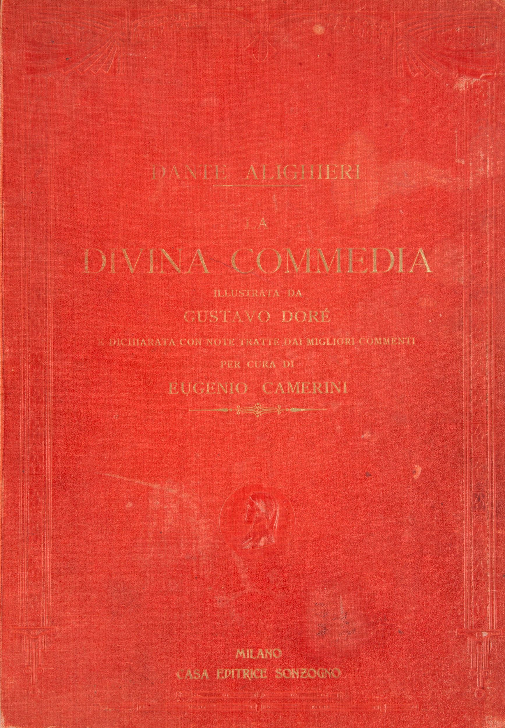 cm 34,5x24,5 Sonzogno, Milano s.d. Riccamente illustrata con tavole a piena pagina. Strappo con mancanza alle prime 2 carte (frontespizio e ritratto) che interessa marginalmente l'incisione con il ritratto di Dante del Dorč. Legatura editoriale in tela rossa con titoli in oro e fregi a rilievo ai piatti e al dorso. Lotto non passibile di restituzione.