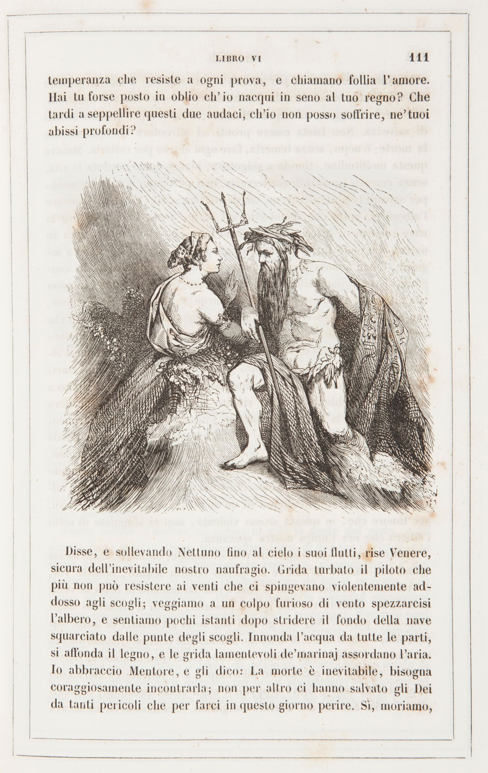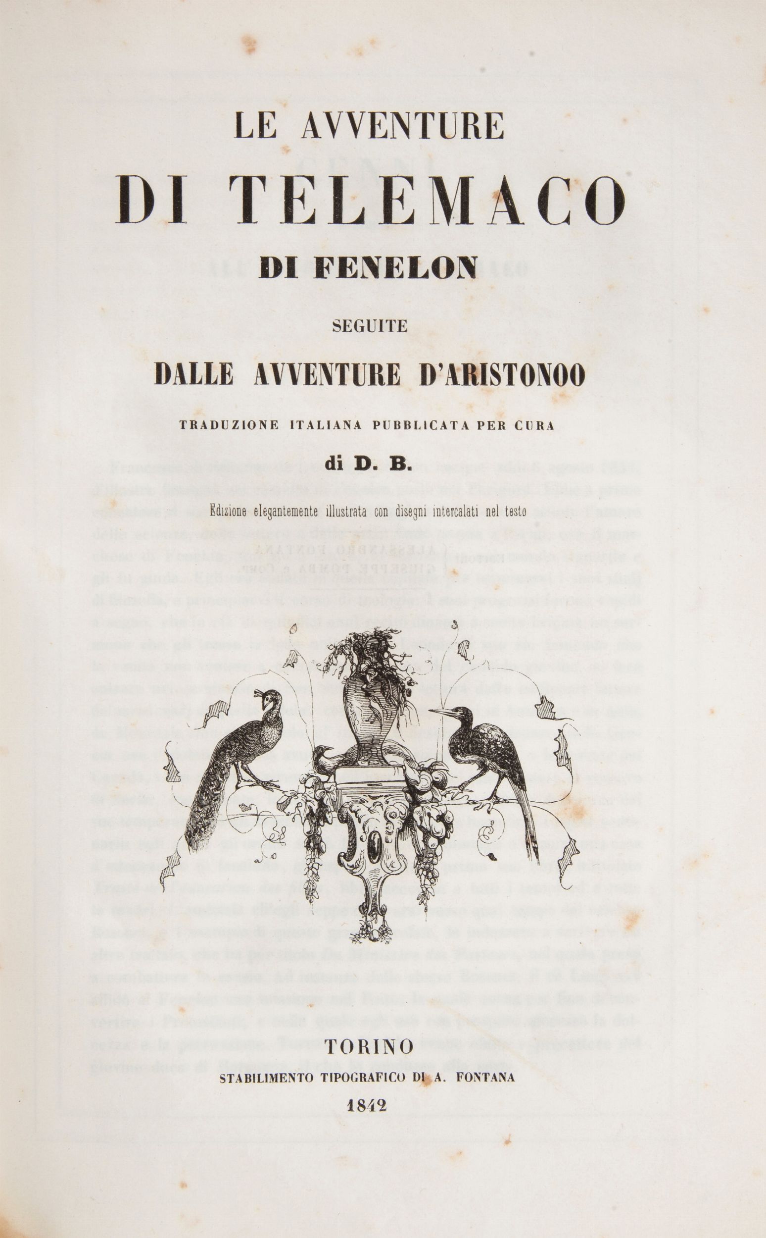 cm 26x18 Fontana, Torino 1842 In 8° grande. Con 12 pregevoli illustrazioni a piena pagina e numerosissime illustrazioni nel testo. Ritratto dell'autore in antiporta. Traduzione della celebre e fortunatissima opera di Fenelon (1651-1715) apparsa per la prima volta clandestinamente a Parigi nel 1699 e quindi più volte ristampata quale manifesto delle idee pedagogiche e politiche dell'autore. Questa edizione a cura della società costituita tra Alessandro Fontana e l'attivissimo Giuseppe Pomba si segnala per la finezza delle illustrazioni. Legatura in mezza pelle con titoli e fregi al dorso e piatti in tela incisa.