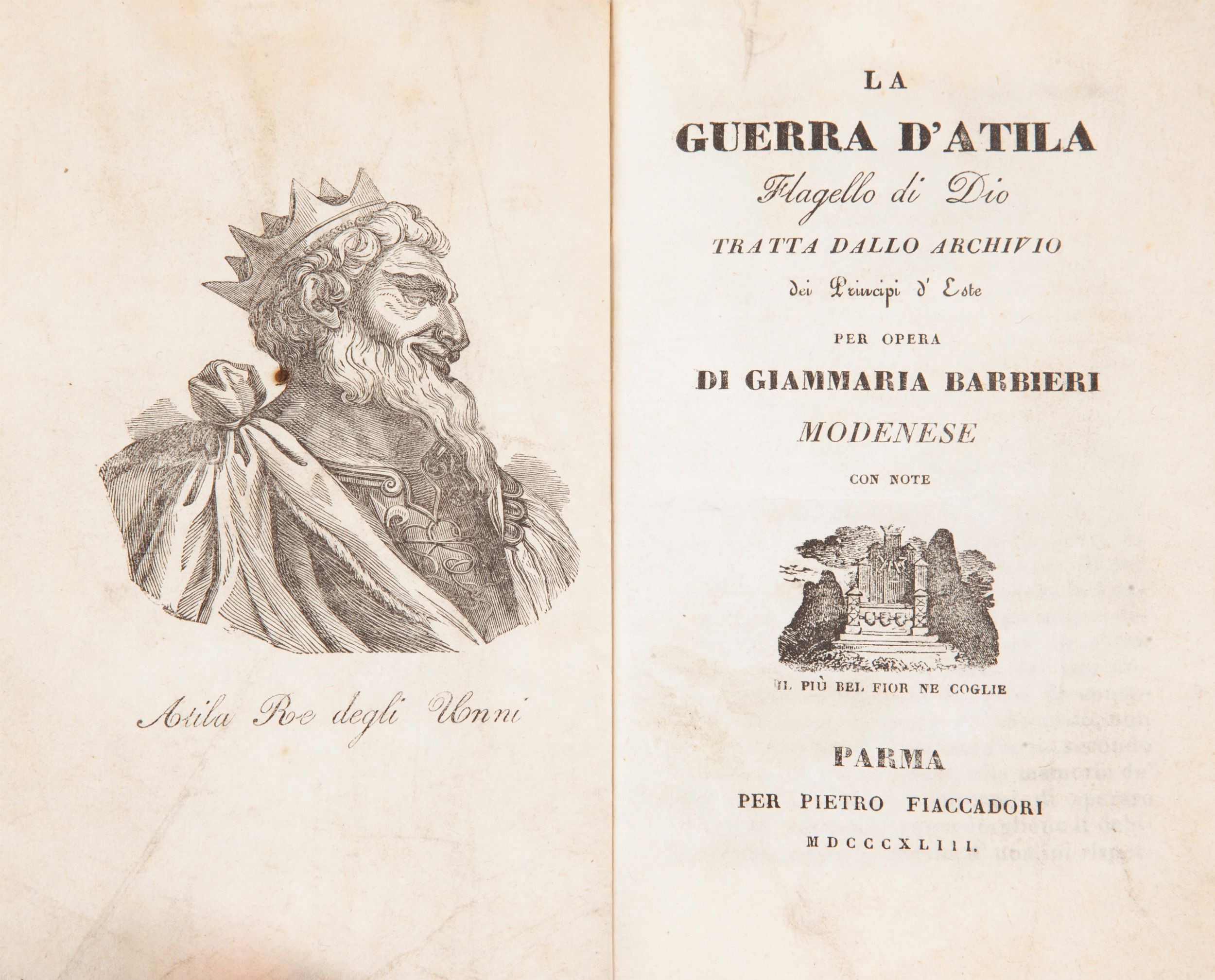 Pietro Ficcadori, Parma 1843 In 16. Ritratto di Attila all'antiporta. Edizione ottocentesca di uno studio stampato nel 1568 dallo storico e filologo modenese Gian Maria Barbieri (1519-1574), desunto da fonti archivistiche della corte estense, di cui egli fu cancelliere e cerimoniere, prima traduzione in prosa della prima parte del poema epico cavalleresco di Niccolò da Casola, redatta a partire da un celebre manoscritto databile nei primi decenni della seconda metà del Trecento. L'Attila di Barbieri è al contempo una grande opera filologica di studio della lingua provenzale, un affresco storico dell'Italia contemporanea riletto attraverso la leggenda delle invasioni barbariche, un quadro della vita cortigiana del tempo e, soprattutto, la celebrazione della famiglia estense. Legatura in mezza pelle moderna con titolo in oro al dorso.