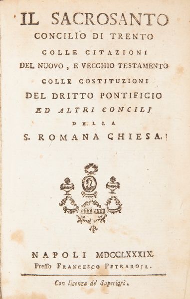 cm 19.5x12 Francesco Petraroja, Napoli 1789 In 8°. Sono riportate, sessione per sessione, dal 1545 al 1568, le bolle papali, i canoni e i decreti del Concilio di Trento. Libro di notevole interesse. Legatura in piena pergamena coeva.