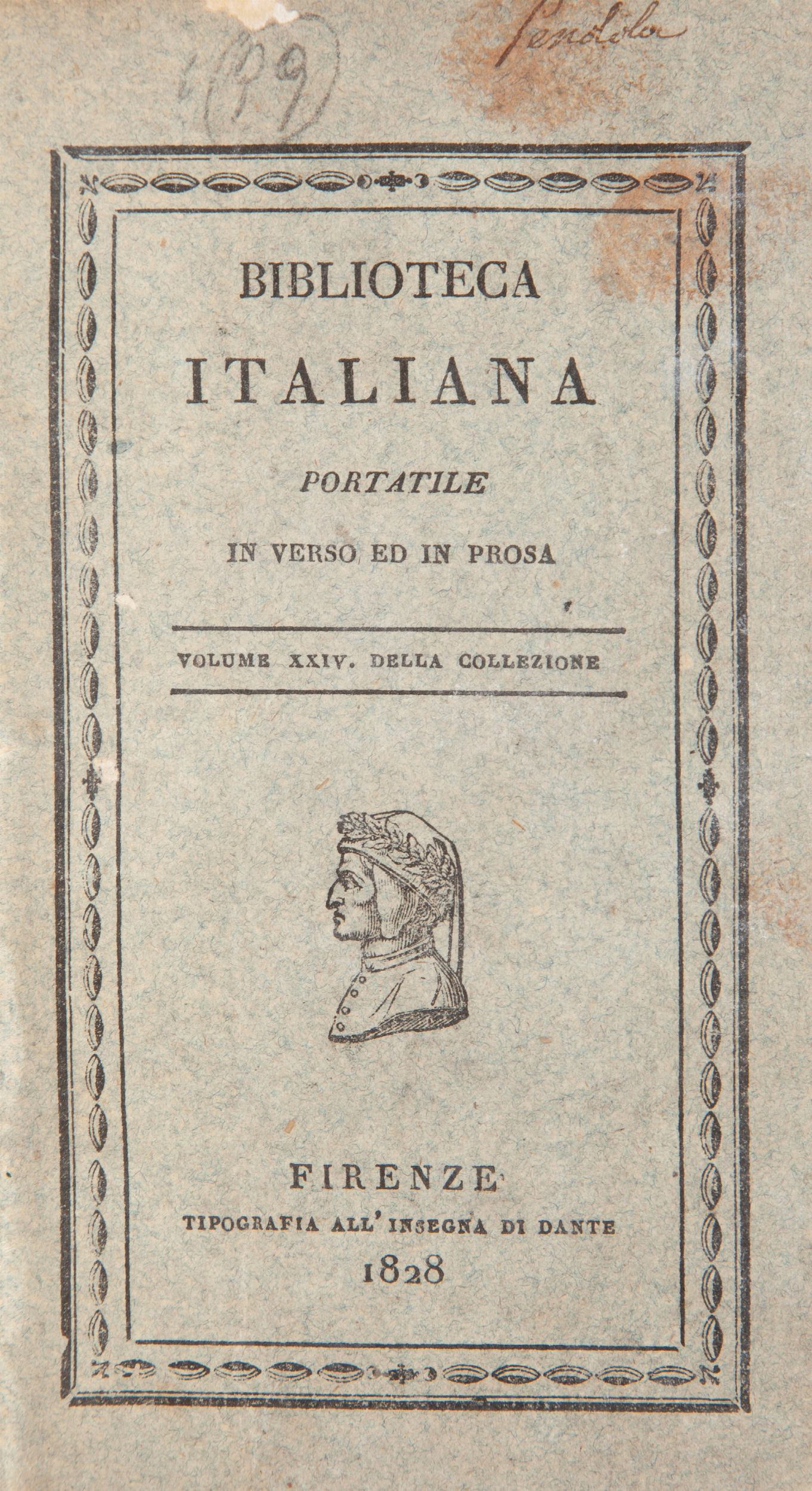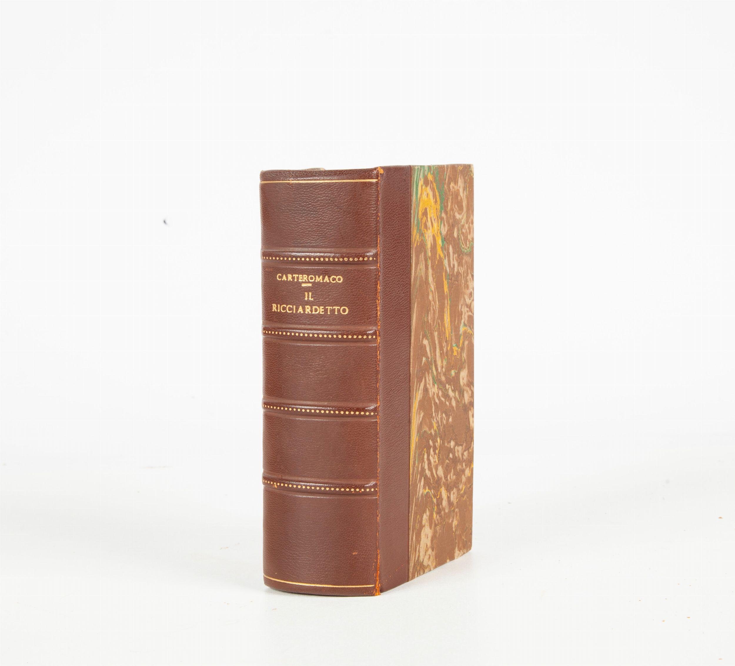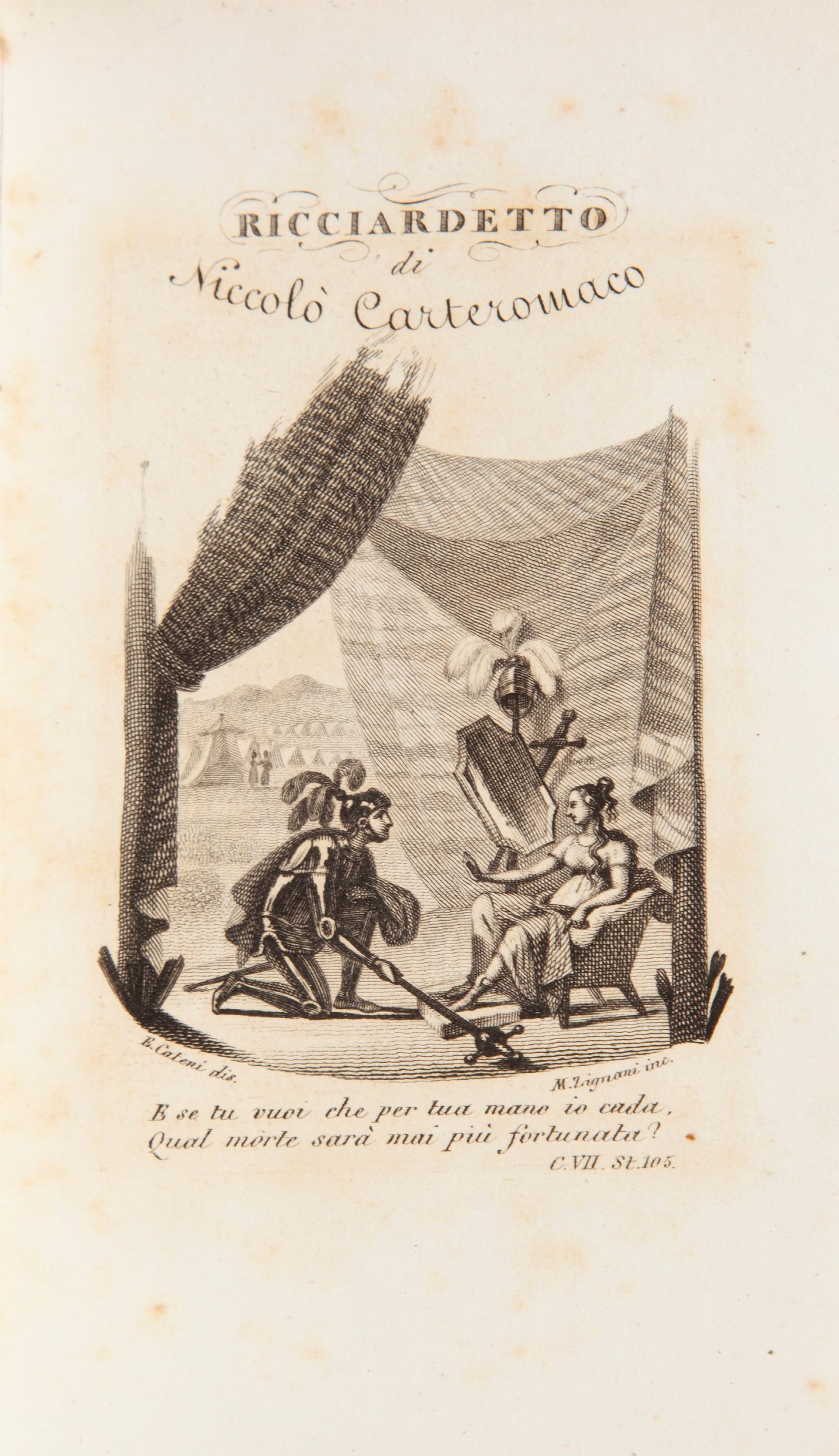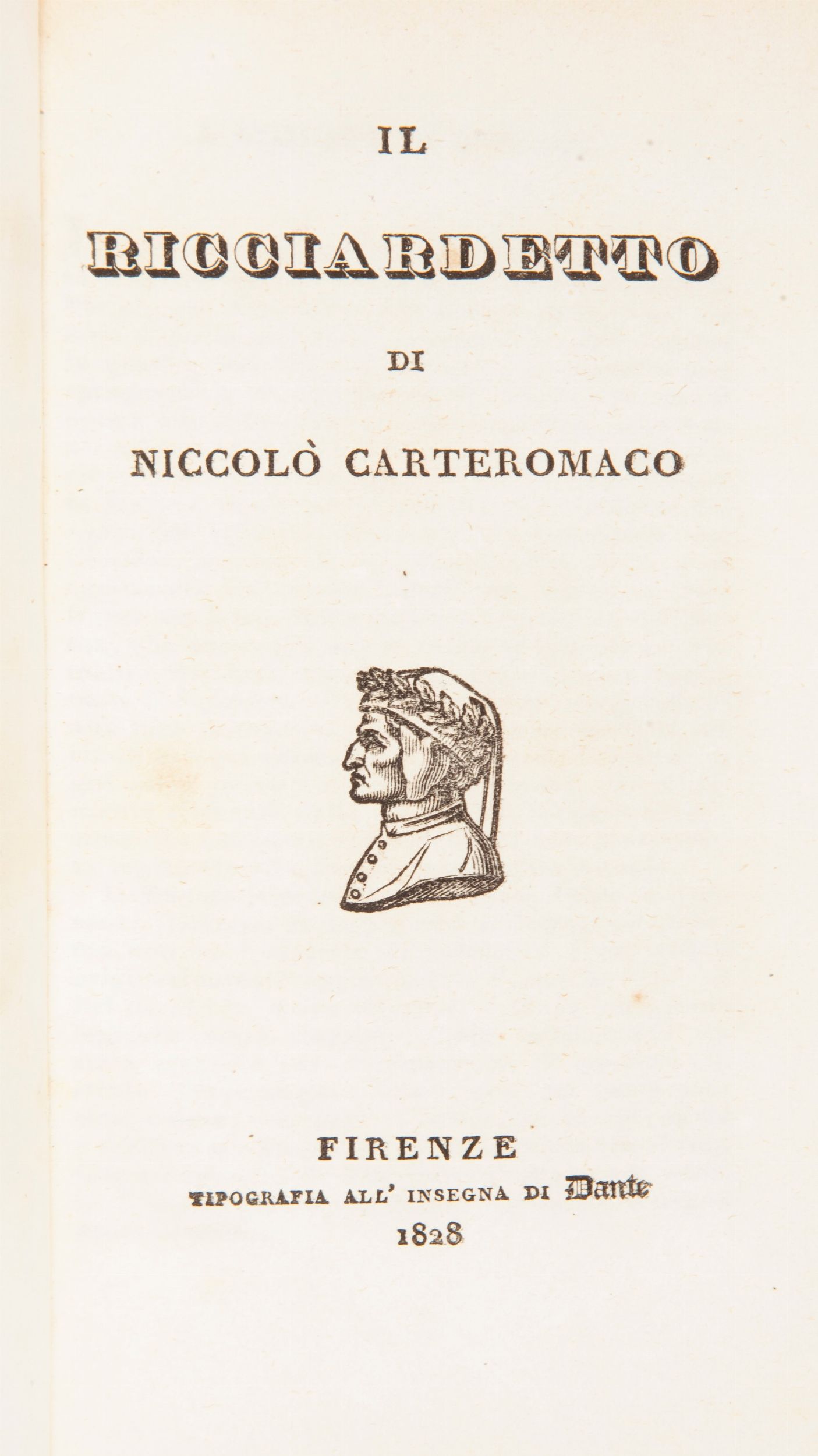 cm 16x9 All'Insegna di Dante, Firenze 1828 In 16°. Due incisioni di M.Zignani di cui una al frontespizio su disegni di E.Cateni. Poema in 30 canti, scritto dal Forteguerri (Pistoia, 1674-1735) tra il 1716 e il 1725 e pubblicato solo nel 1738. In esso il poeta satirico cercò di fondere lo stile del Pulci, del Berni e dell'Ariosto. Lo pseudonimo Carteromaco costituisce la forma grecizzata del nome Forteguerri.