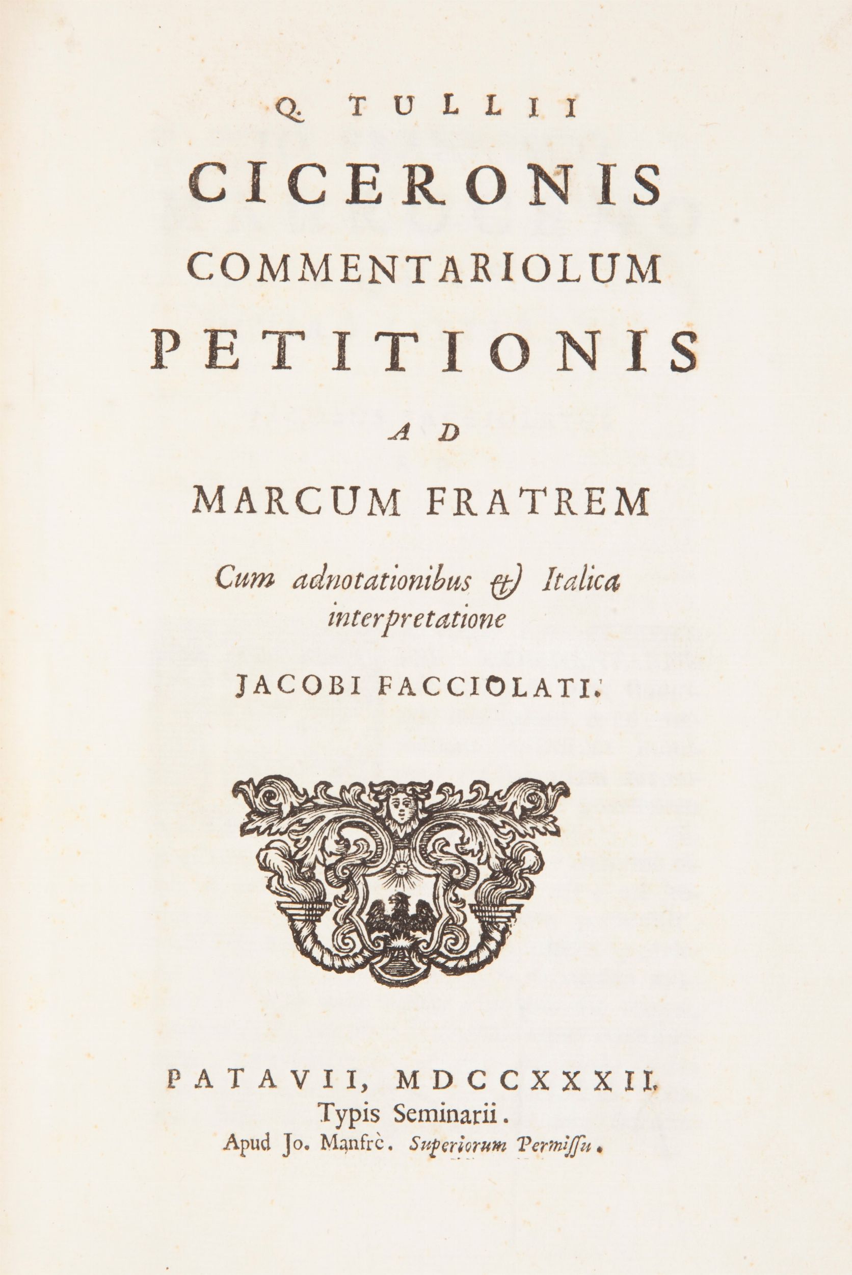 In 8°. Il Commentariolum Petitionis (manualetto di campagna elettorale), conosciuto anche come De petitione consulatus (sulla candidatura al consolato), è ritenuto un saggio epistolare scritto da Quinto Tullio nel 65-64 a.C. per la campagna elettorale del 64 a.C. del fratello Marco Tullio dalla quale sarebbe uscito console della Repubblica romana nel 63 a.C.. Il saggio, con testo in latino ed italiano, curato e commentato in questa edizione dal poeta e latinista padovano Jacopo Facciolati non contiene alcuna informazione che Cicerone, esperto politico, già non conoscesse ed è scritto in uno stile altamente retorico al punto che la sua autenticità è stata messa in dubbio da molti studiosi che ritengono infatti l'opera non autografa di Quinto Tullio ma da un retore ignoto del periodo tra Augusto e Traiano mentre altri ritengono che il libretto sia stato effettivamente scritto da Quinto allo scopo di essere pubblicato forse come propaganda. Legatura in cartonato coevo.