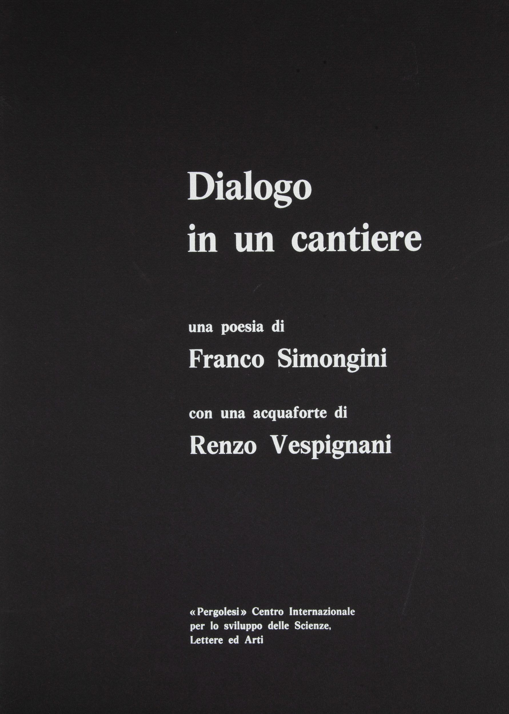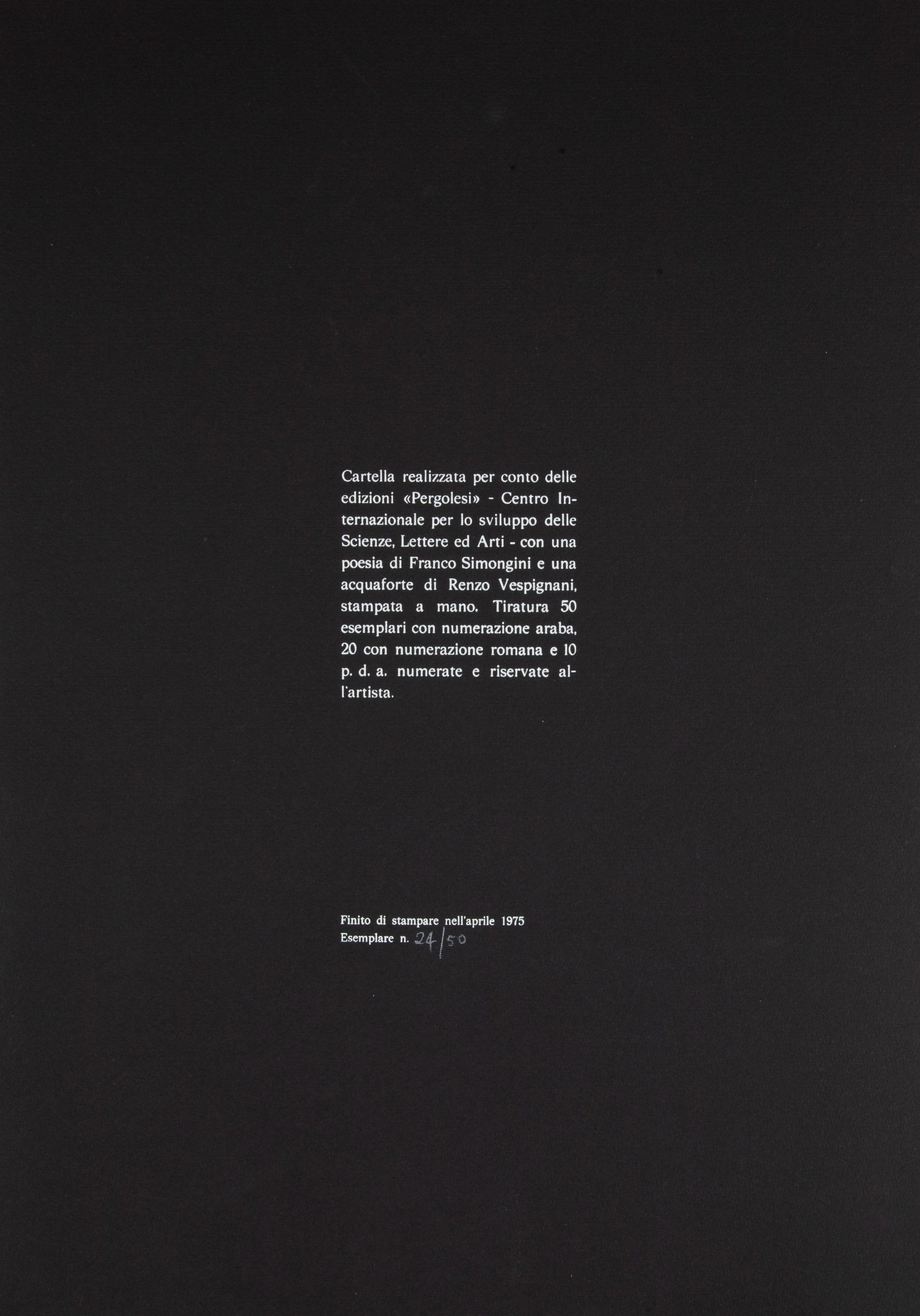 Acquaforte/puntasecca, cm 49,5x35 1975 Cartella contenente un'acquaforte originale di Renzo Vespignani ed una poesia di Franco Simongini. Edizioni Pergolesi Arte-Scienze-Lettere Italy (timbro a secco in basso a sinsitra). Firma numerazione e data a matita. Vespignani '75, 24/50. Timbro a secco Renzo Vespignani