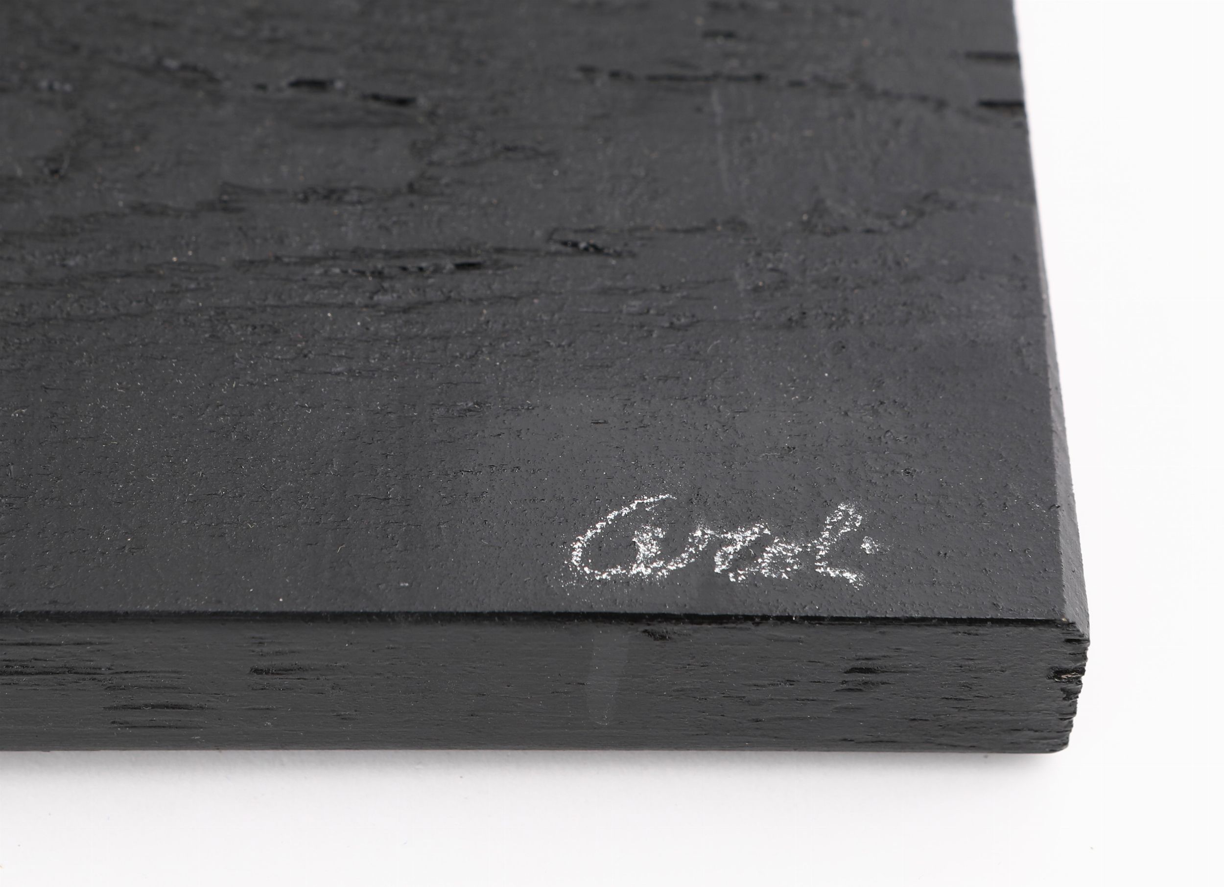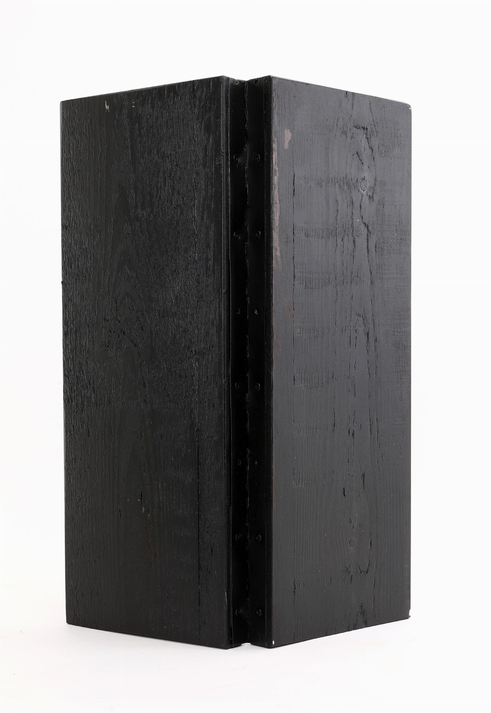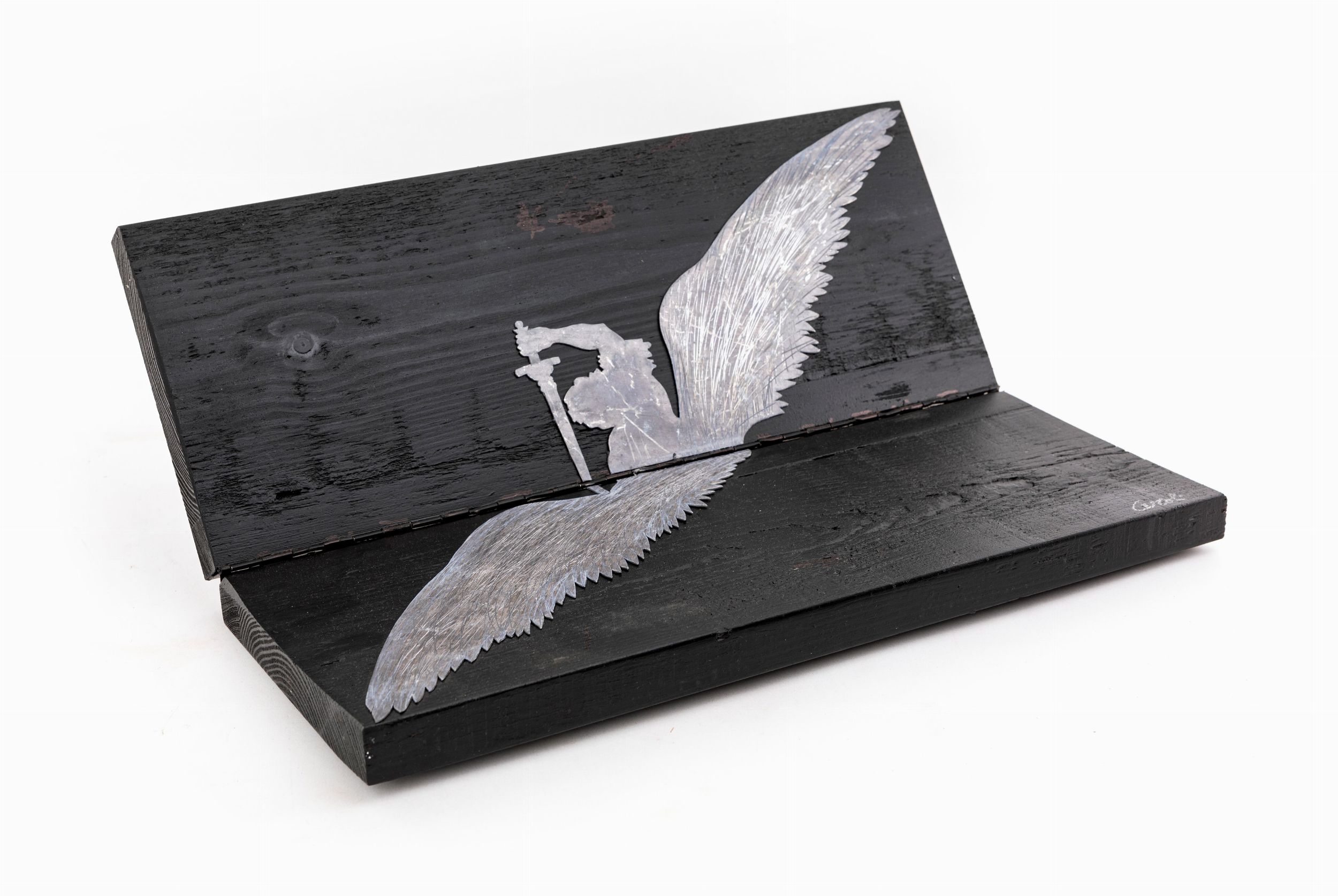 Scultura in legno di pino di Russia con profilo applicato in piombo, cm 45x20xh18