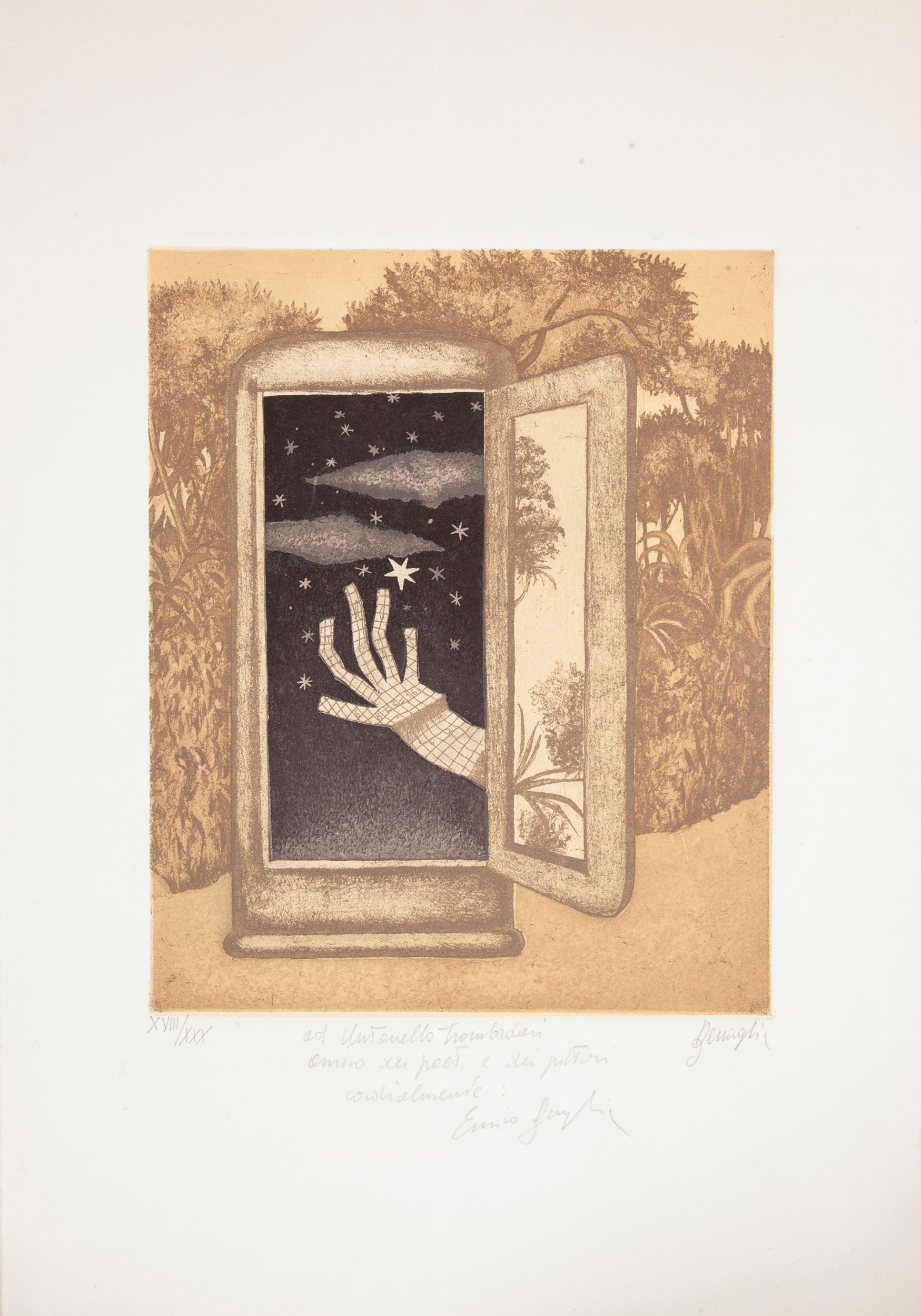 Firma, numerazione e dedica Benaglia / ad Antonello Trombadori / amico dei poeti e dei pittori / cordialmente / Enrico Benaglia / XVIII/XXX.
