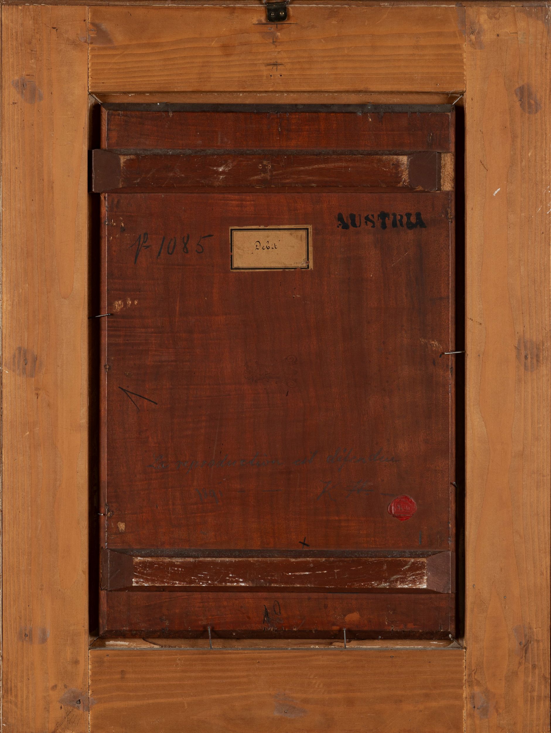 al retro, sul supporto, vecchia etichetta con titolo, timbro a ceralacca ed iscrizione dell'artista firmata e datata: La reproduction est defendue / K. H. 1891