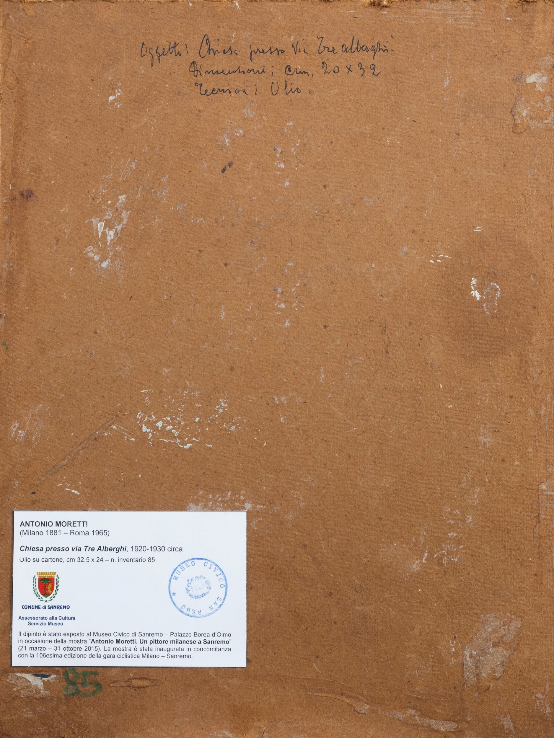al retro, cartellino a stampa con riferimenti all'opera e timbro del Museo Civico di Sanremo in occasione della mostra Antonio Moretti. Un pittore milanese a Sanremo (21 marzo - 31 ottobre 2015)