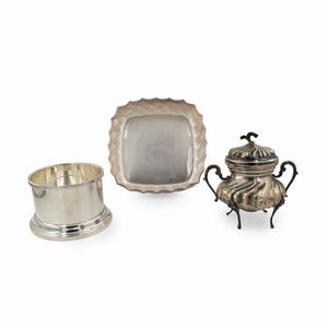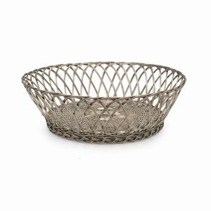 peso complessivo 366 gr. Italia, XX Sec. composto da: 1 cestino circolare in argento cesellato con motivi di [..]
