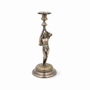 h. 33 cm. XIX-XX Sec. corpo cesellato con una figura maschile nell'atto di sorreggere una cornucopia, base ci [..]