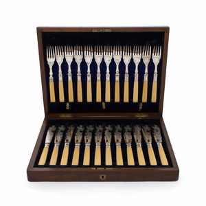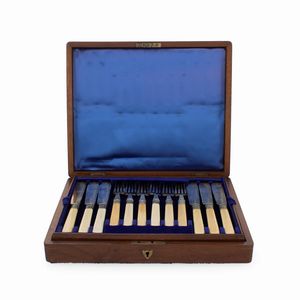6x36x27 cm. Inghilterra, XIX-XX Sec. entro scatola in legno, composto da: 12 forchette da pesce 12 coltelli [..]