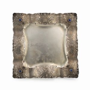 29x29 cm. Italia, XX Sec. orafo Rino Maserati, Milano, corpo di forma quadrata smerlato e cesellato con motivi [..]