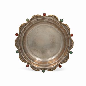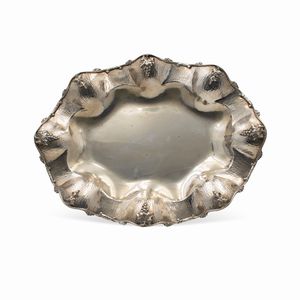 55x38,5 cm. Italia, XX Sec. orafo Gabriele De Vecchi, Milano, corpo liscio, bordo sbalzato e cesellato con motivo [..]