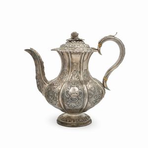 h. 23 cm. Londra, 1834 orafo William Hewitt, corpo piriforme sbalzato e cesellato con motivi vegetali e floreali, [..]