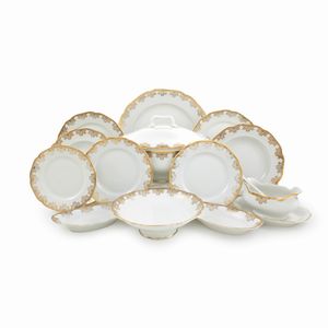 Italia, 1941 in porcellana avorio con decorazione dorata, marchio della produzione, usure, composto da: 24 piatti [..]