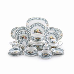 Germania, XX Sec. modello Basket in porcellana policroma decorata con cesto di frutta e bordo a griglia verde, [..]