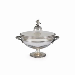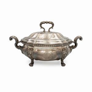 21x40x20 cm. Londra, 1747 orafo Sebastian & James Crespell, corpo sbalzato con manici laterali a volute vegetali, [..]