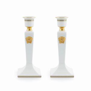 21,5x8,5x8,5 cm. Germania, XX Sec. coppia di candelieri collezione Gorgona in porcellana bianca e dorata, marchio [..]