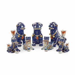 h. 9- 17 cm. Portogallo, XX Sec. in porcellana policroma a foggia di cani di Pho, marchio della produzione, [..]