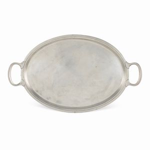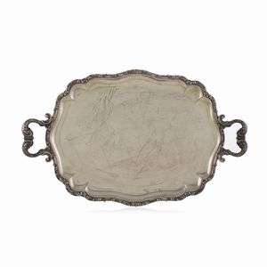 55x38,5 cm. Italia, XX Sec. orafo Gabriele De Vecchi, Milano, corpo liscio, bordo sbalzato e cesellato con motivo [..]