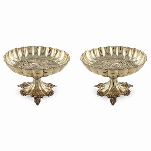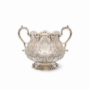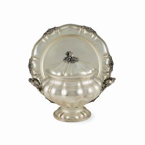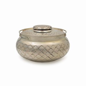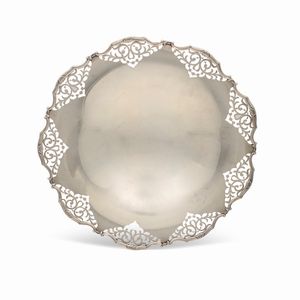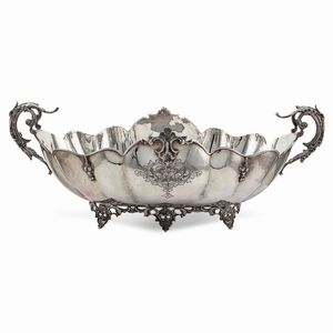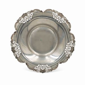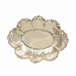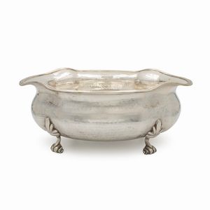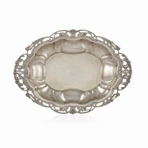 12x30x33 cm. Italia, XX Sec. orafo Luigi Calegaro, Padova, corpo smerlato di linea ovale, poggiante su quattro [..]
