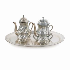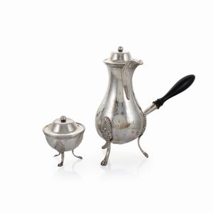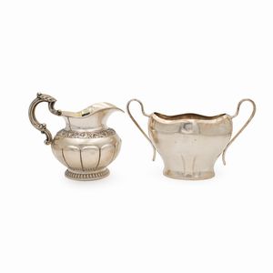 h massima 11,5 cm. XX Sec. composto da: 1 lattiera in argento, peso 192 gr. 1 zuccheriera in metallo argentat [..]